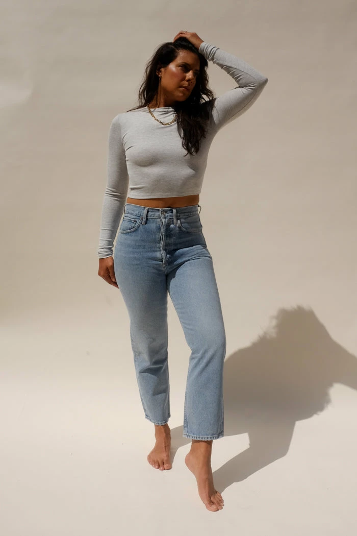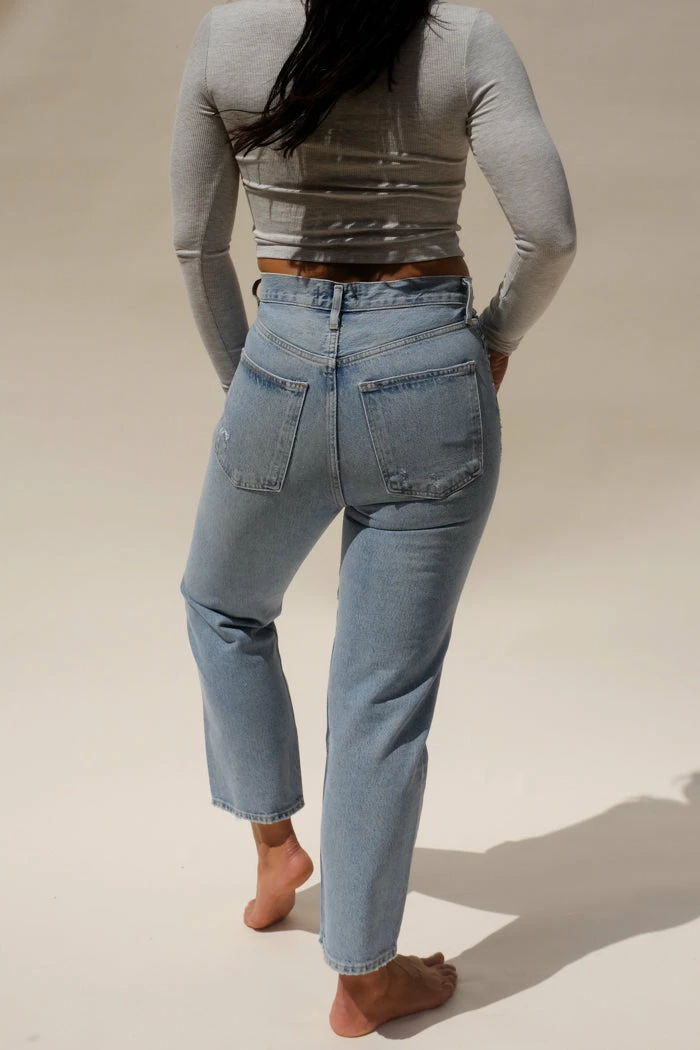Agolde 90’s crop loose jeans in clean vintage light blue Replica wash. A cropped version of the iconic 90’s jean. This decade inspired mid-rise is designed to sit relaxed on the waist with an eased up fit through the body. Non stretch denim. Button fly.
