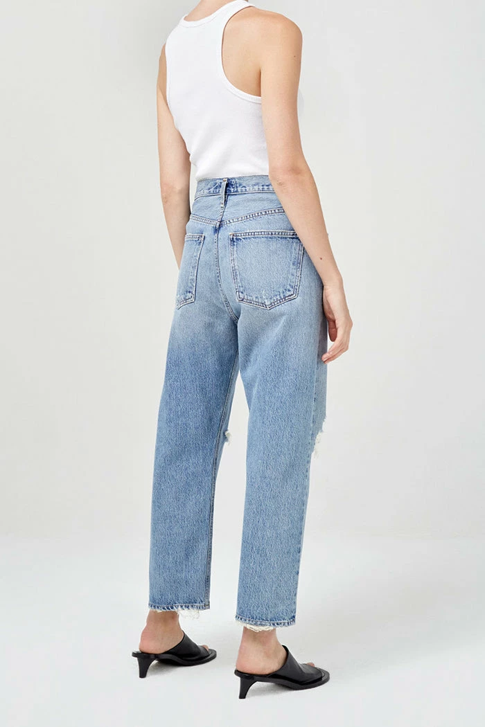 Agolde 90’s crop loose jeans in ripped vintage light blue suspend wash. A cropped version of the iconic 90’s jean. This decade inspired mid-rise is designed to sit relaxed on the waist with an eased up fit through the body. Non stretch denim. Button fly.
