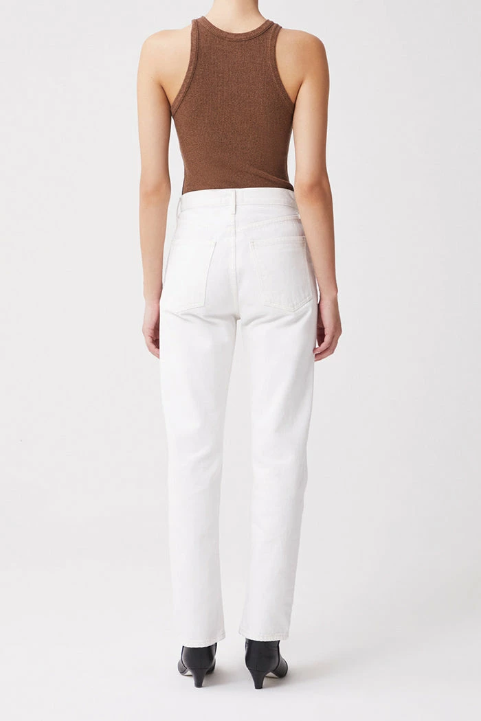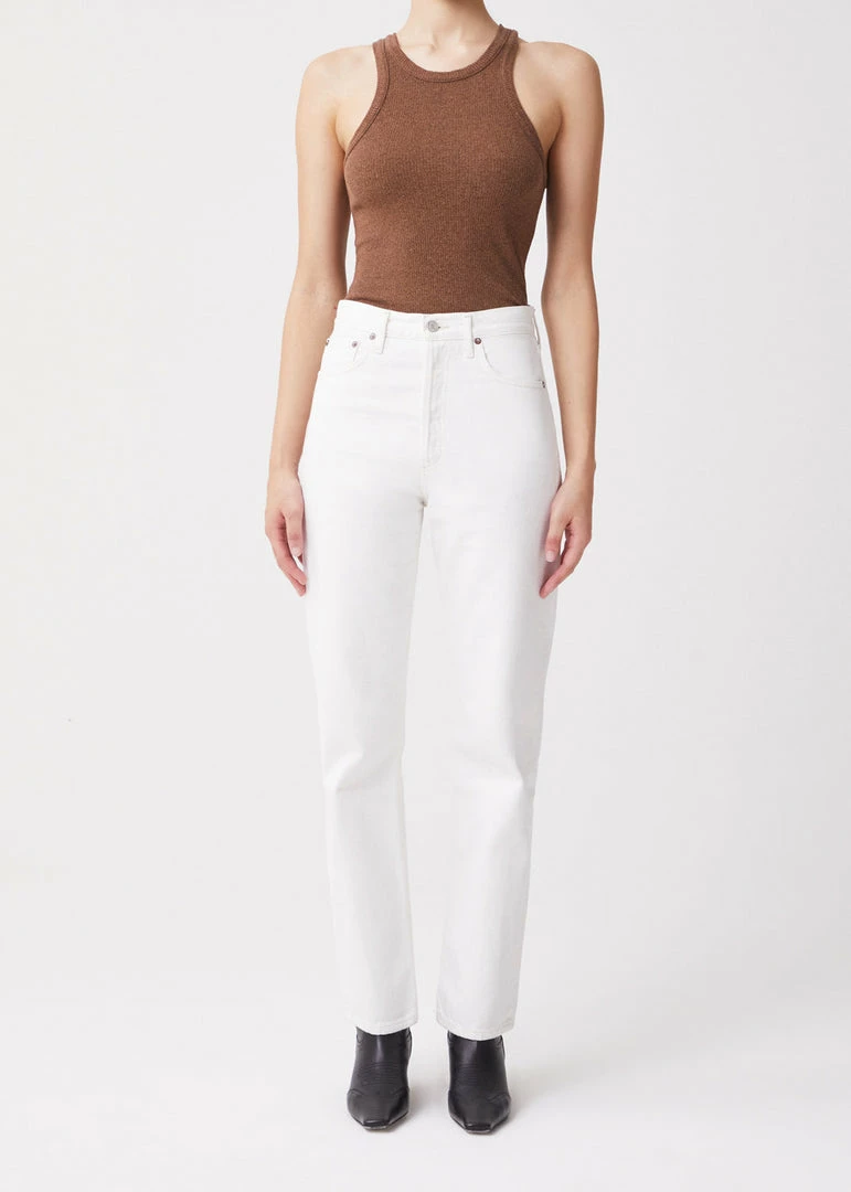 Agolde 90’s pinch waist, high rise in clean off-white wash Drum. This is an update to the best selling 90’s jean, but meant to fit more high rise and fitted through the waist.