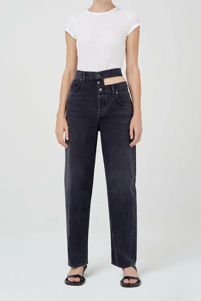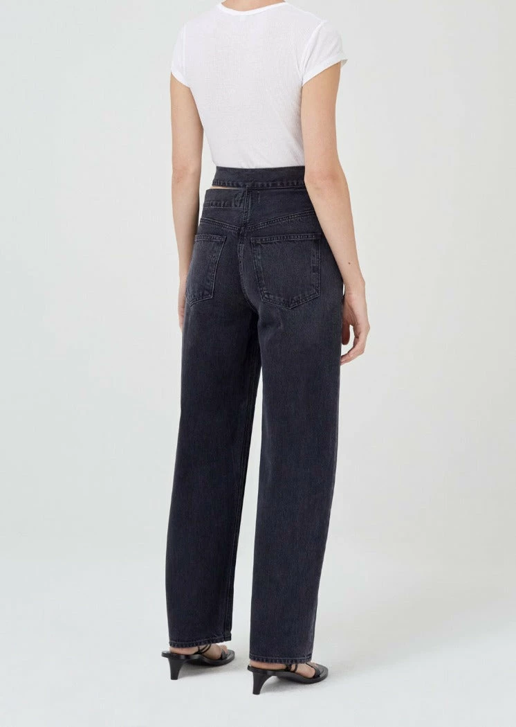 Agolde broken waistband jean in conduct washed black. An easy, slightly relaxed straight fit with a broken waistband detail to show a sudden flash of skin. Super soft non-stretch organic denim with a slight drape. Button fly.