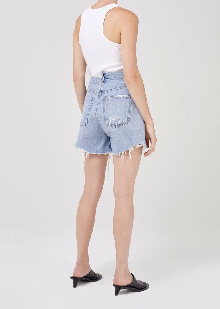 Agolde criss cross boyfriend fit denim shorts, in vintage symbol blue wash. Cut with an easy leg and unfinished hem. Can be styled rolled. Non stretch, button fly closure.