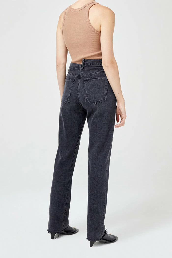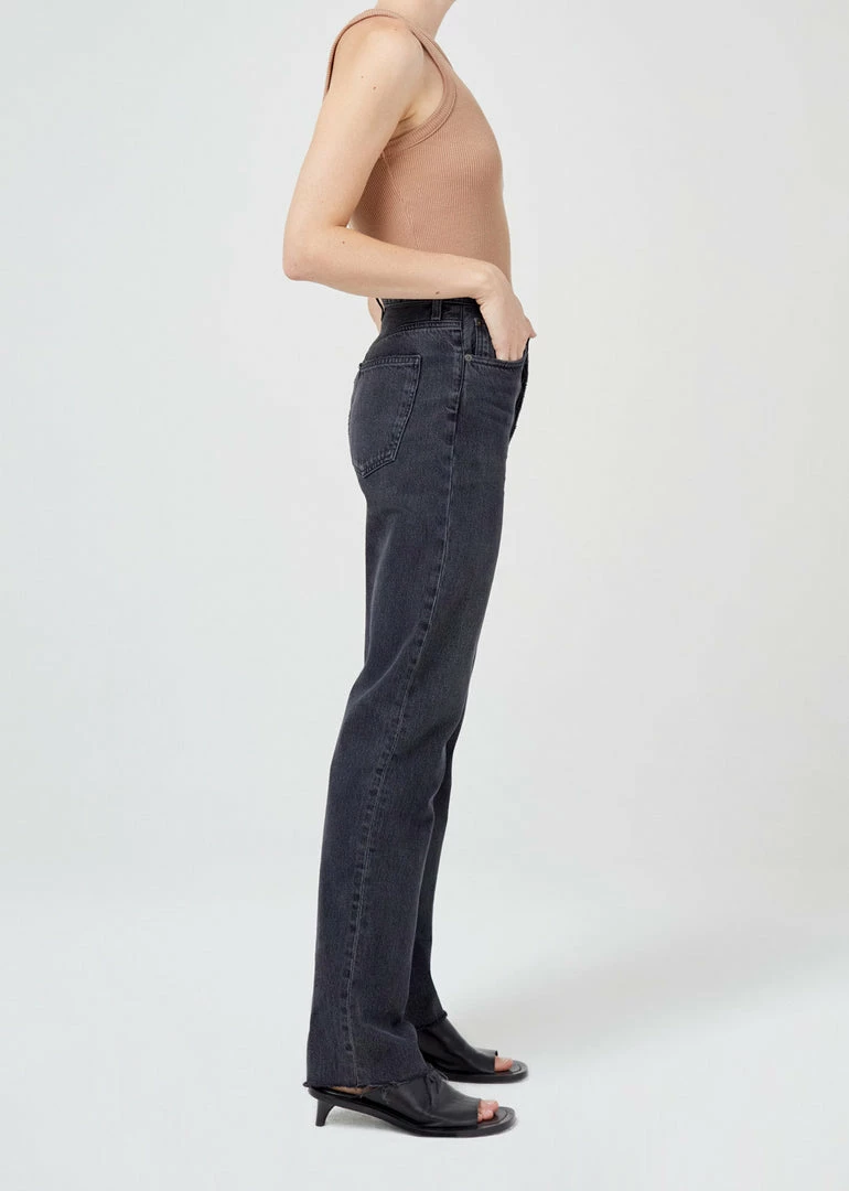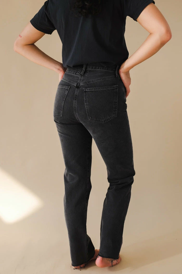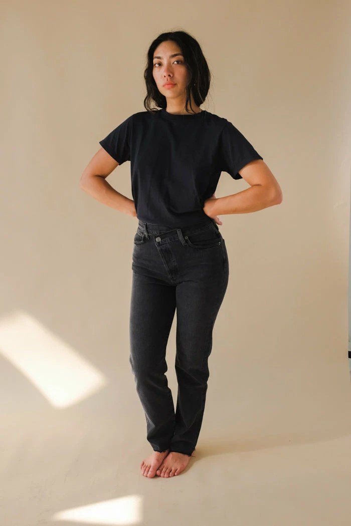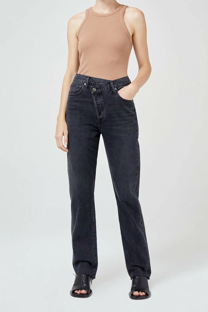 Agolde Criss Cross straight jeans in washed black shambles wash. An update to the best-selling criss cross fit. This true straight silhouette is cut with a high rise, offset back waistband and criss cross button-front detail. Light clean washed black, super soft non-stretch with a slight drape. Button fly.