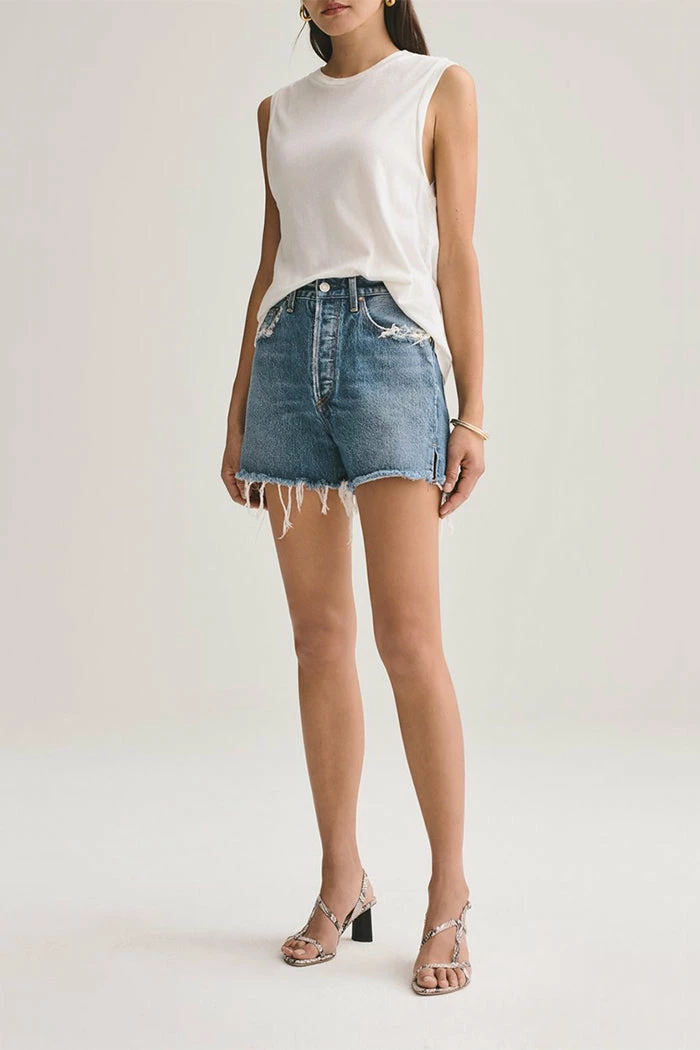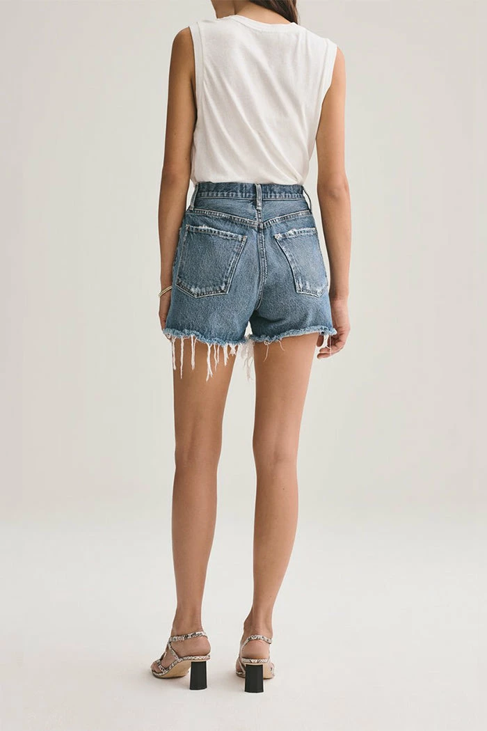 Agolde Dee super high rise denim shorts in precision wash. Cut off jean shorts with ultra high rise short with a closer fit around the thigh crafted from rigid pure cotton. Button fly closure.