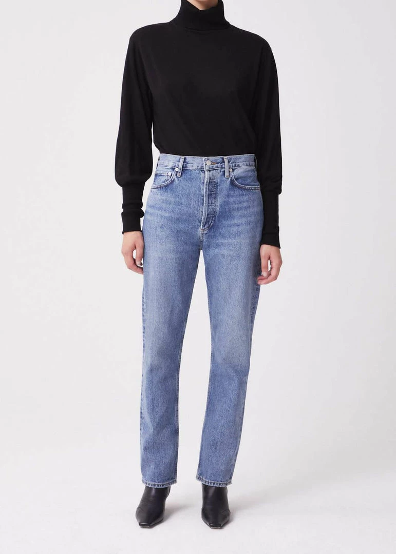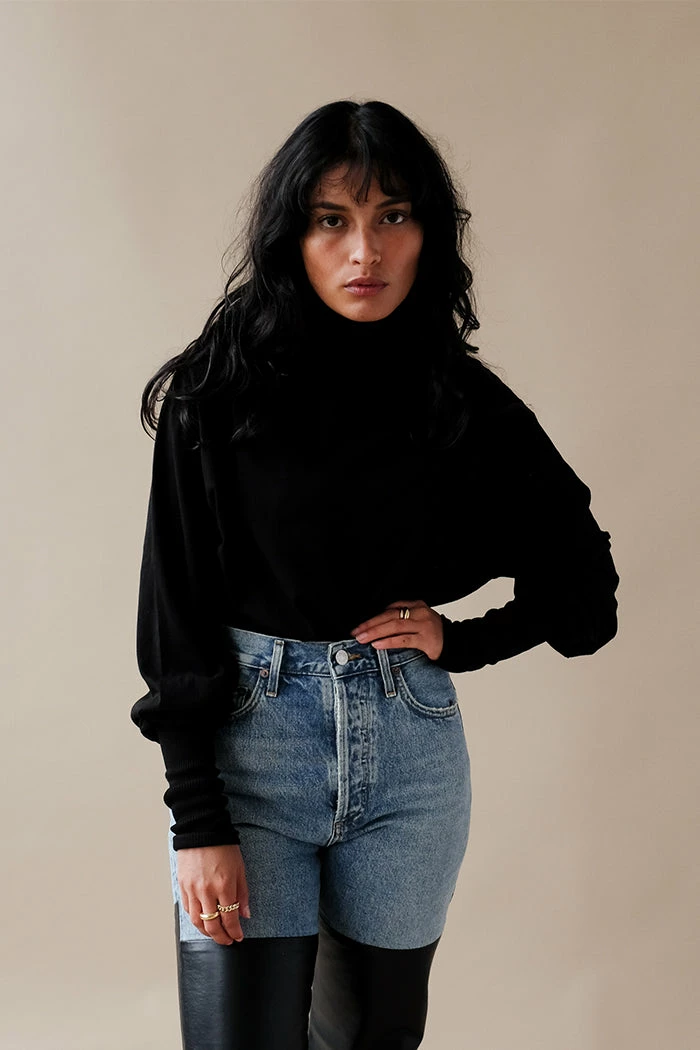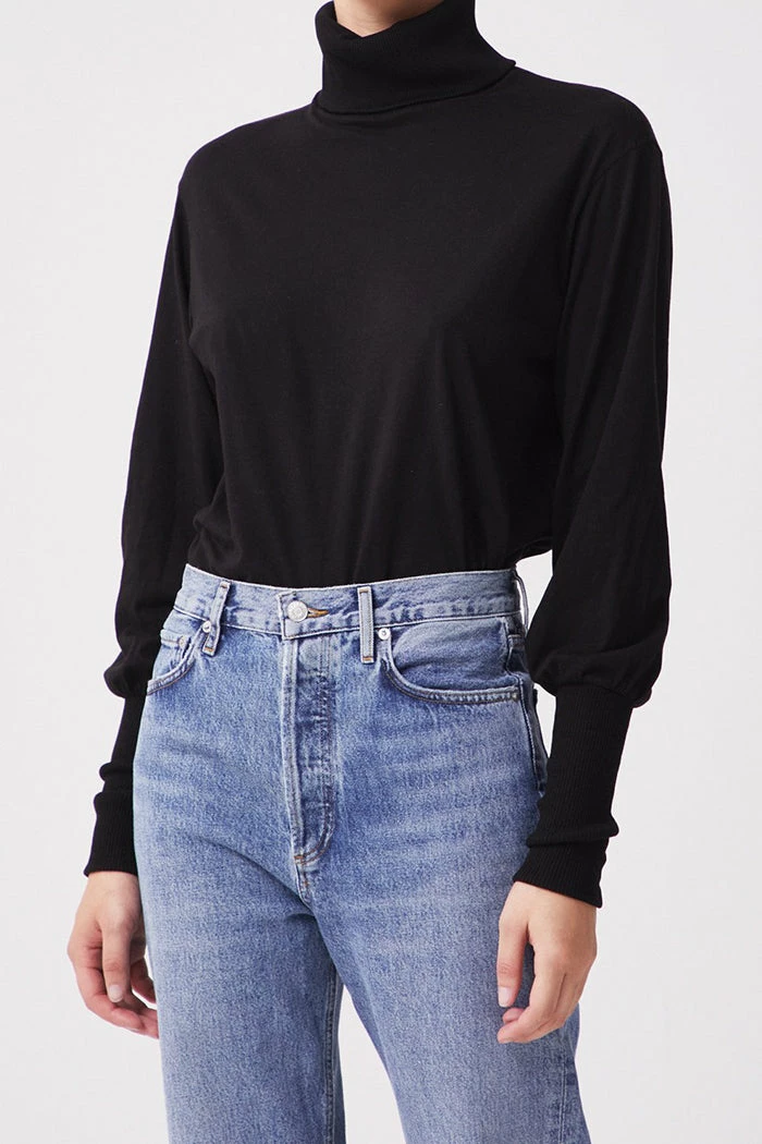 Agolde Funnel neck extended rib long sleeve tee in black. An easygoing essential. This lightweight turtleneck has relaxed sleeves with a form-fitting ribbed cuff.