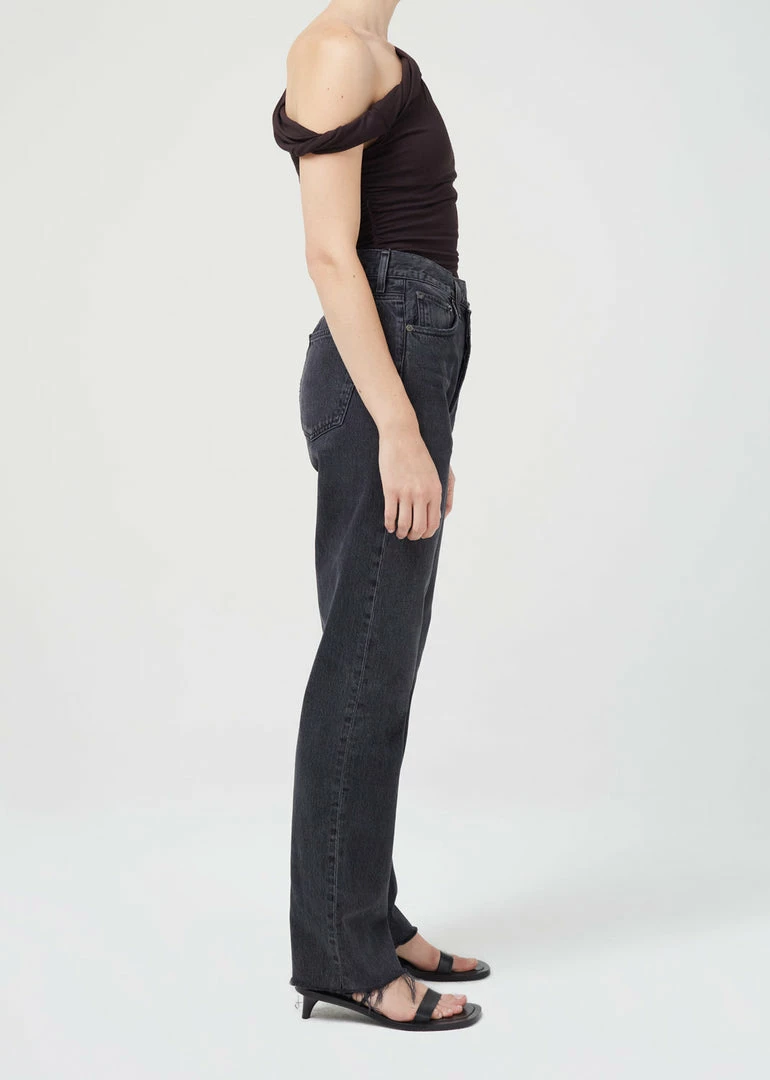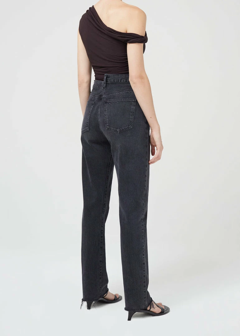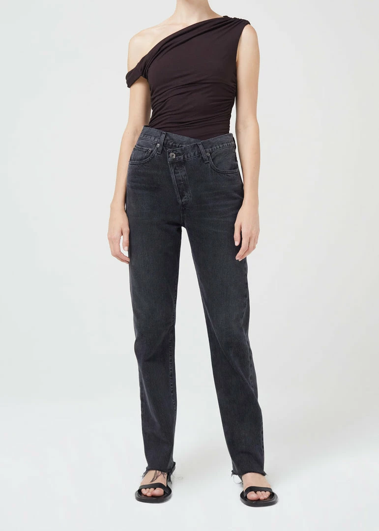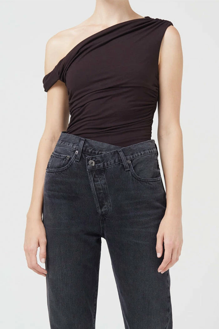 Agolde Hilma twist sleeve ruched bodysuit in brownie dark chocolate brown. Simple yet striking, this shoulder baring tank is crafted from our softest fabric, with the perfect hint of stretch. Tuck yours into denim to complete the look.