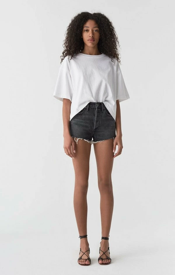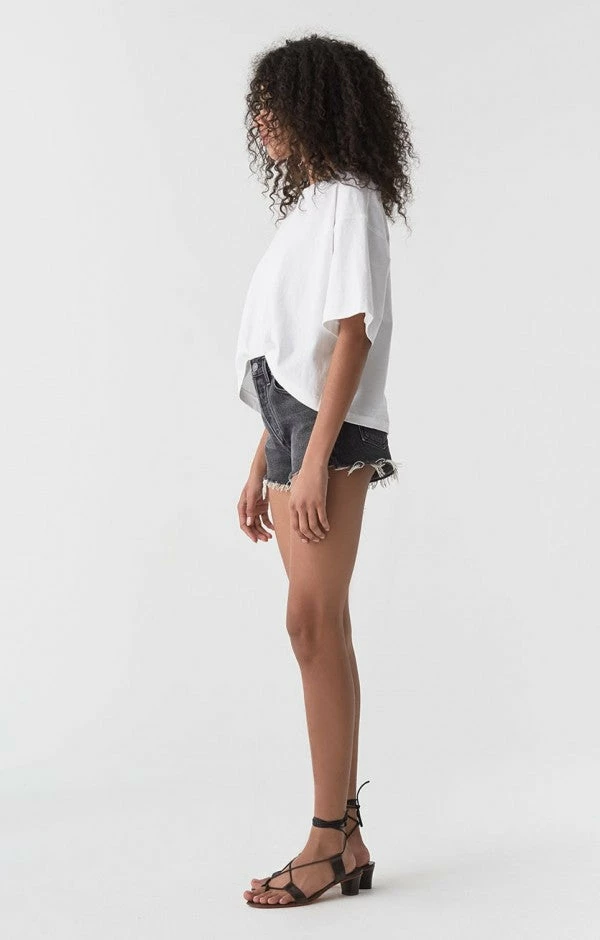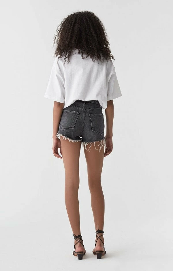 Agolde high rise Jaden cut off shorts in helix. Washed out grey denim is frayed for a lived-in look.