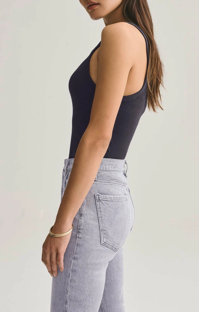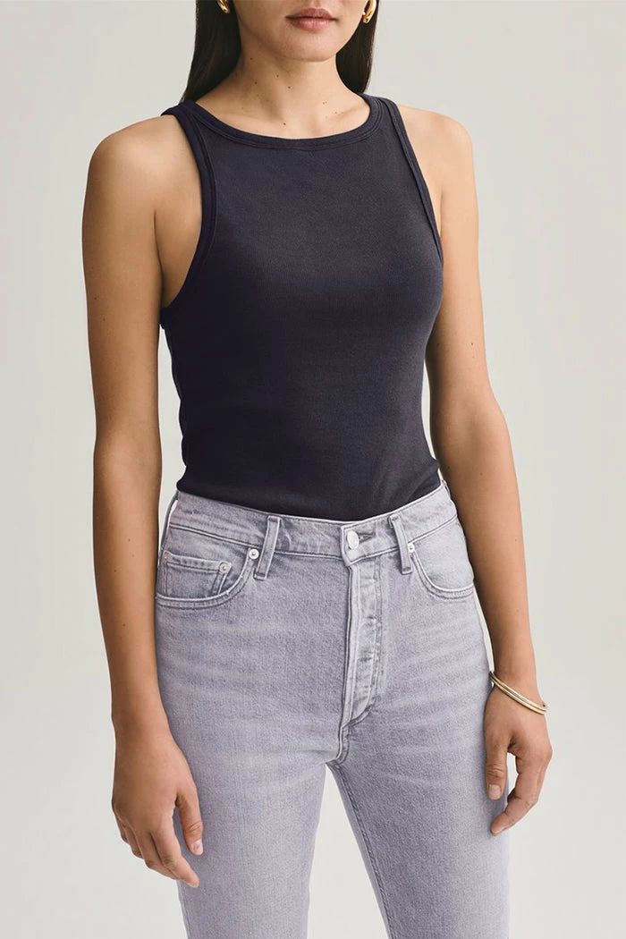Agolde black ribbed high neck tank top. Ultra flattering, your new go-to. 90’s style rib tank features a square high neck.