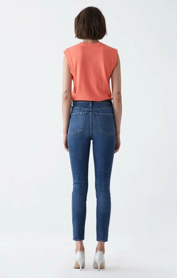 Agolde Nico hi-rise, slim, Subued wash denim. A classic medium blue indigo in comfort stretch denim. Comfort Stretch. Authentic vintage look with slight stretch for ease.