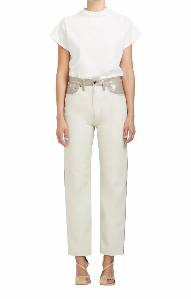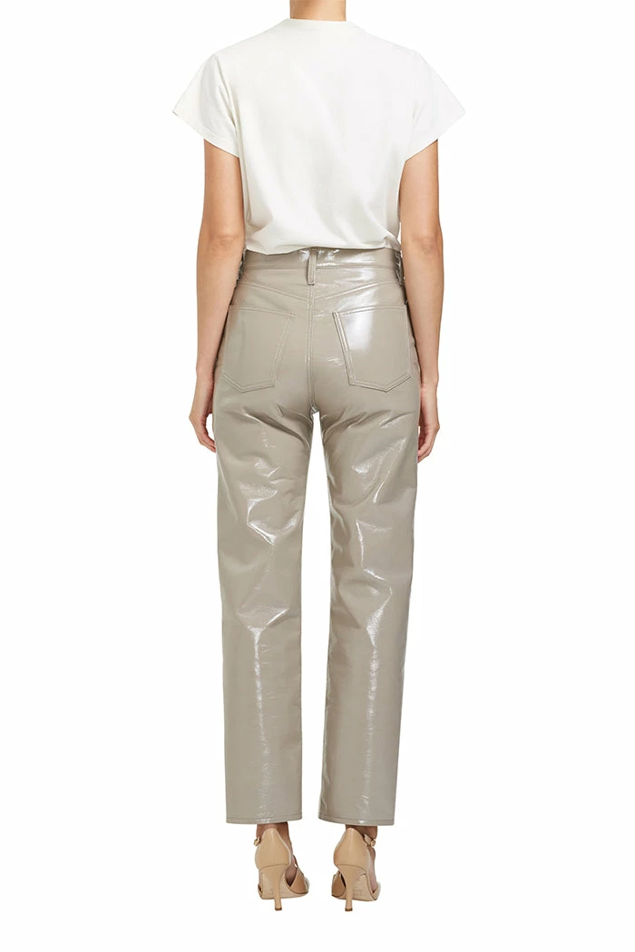 Agolde Paneled 90’s pinch waist recycled leather pants in powder cream and quail patent tan.