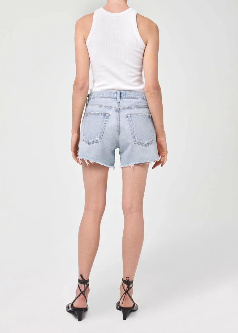 Agolde Parker long jean shorts in jinx wash. Looks like the perfect vintage fit, but tailored to feel as if they were made just for you. With a little added length, the Parker Long is the ultimate classic cut-off. It hugs comfortably at the waist with a roomier fit through the hem and an elongated inseam. You’ll be wearing yours on repeat with a cool tee or a sleek bodysuit. Button fly.