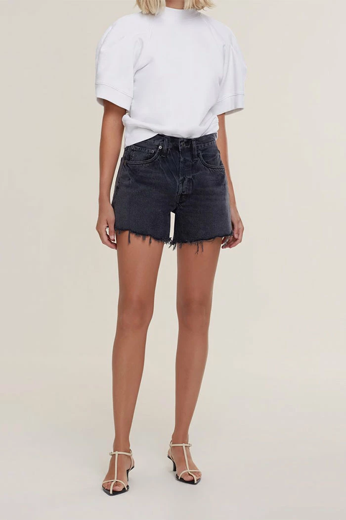 Agolde Parker long shorts in chromatic washed black. Looks like the perfect vintage fit, but tailored to feel as if they were made just for you. With a little added length, the Parker Long is the ultimate classic cut-off. It hugs comfortably at the waist with a roomier fit through the hem and an elongated inseam.Â