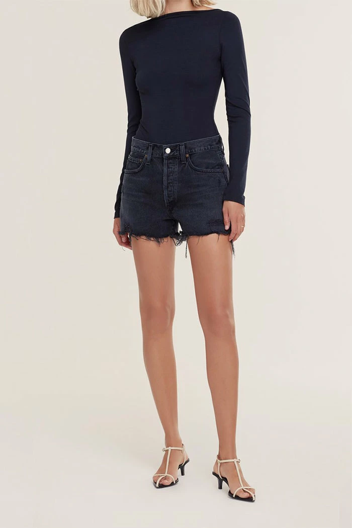 Agolde Parker shorts in vortex black washed denim with frayed hem. Looks like the perfect vintage fit, but tailored to feel as if they were made just for you. Not too short or too tight, the Parker is the ultimate classic cut-off. It hugs comfortably at the waist with a roomier fit through the hem. You’ll be wearing yours on repeat with a cool tee or a sleek bodysuit. Non-stretch, washed down for a super soft hand. Button fly.
