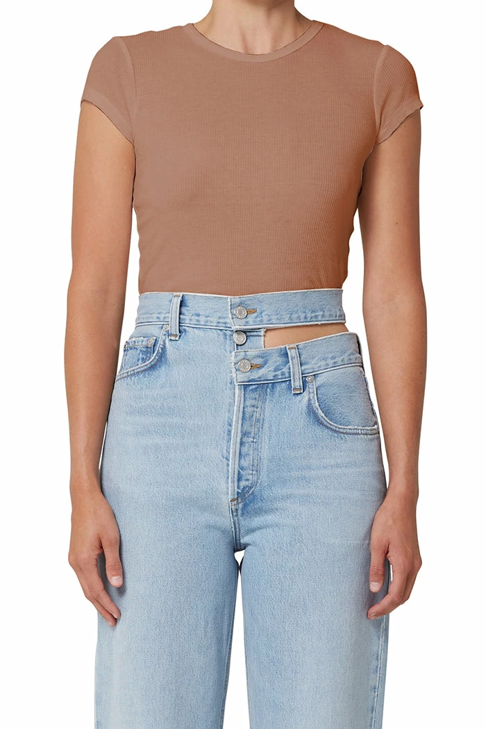 Agolde Ren ribbed tee in Waffle brown taupe. The perfect rib tee. Cut in a barely-there fabric with a super soft hand and form-flattering fit, this go-to basic instantly elevates your look.