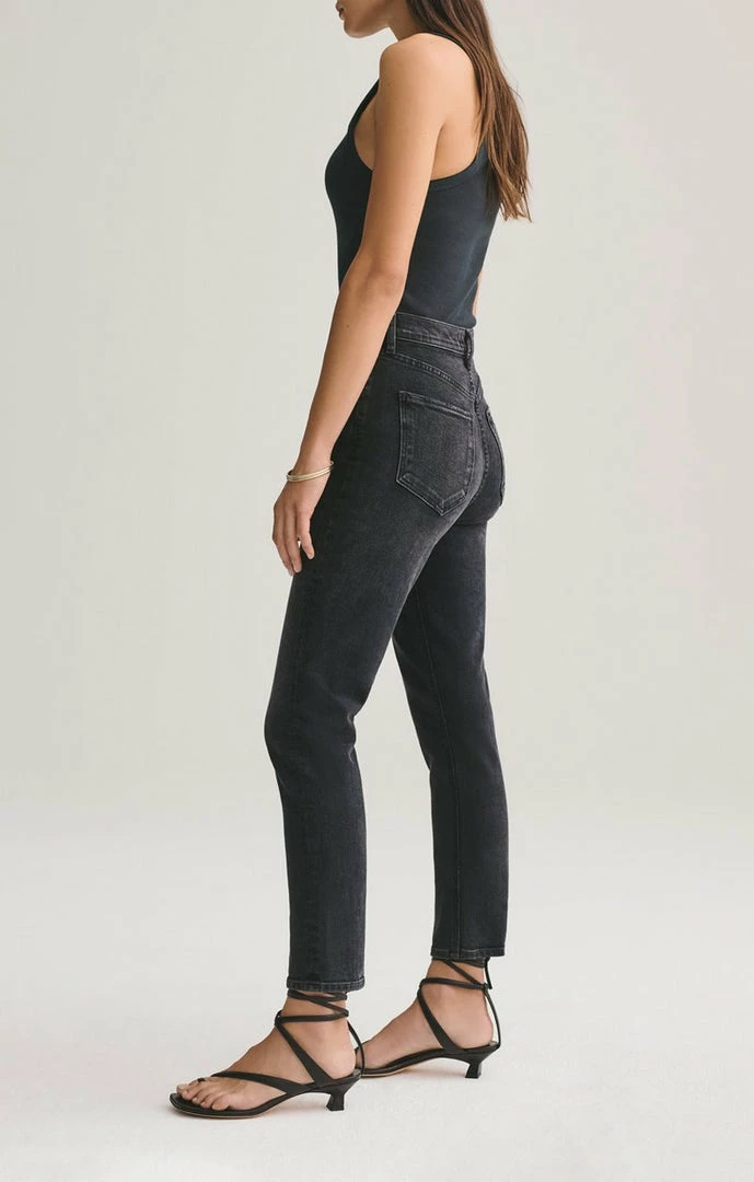 Agolde Riley in washed black denim black pepper. High rise, slim straight leg, sits close to the body with a cropped inseam. Comfort stretch. Button fly closure.