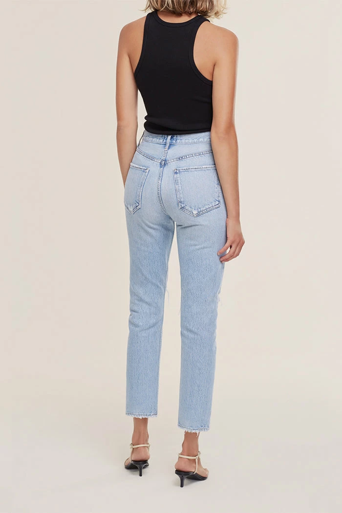 Agolde Riley high rise crop in clear skies light blue wash with distressing at the knees. With a better-than-vintage aesthetic, the Riley is an iconic brand favorite. The flattering high-rise and straight leg hold close to the body for a universally loved look. A cropped inseam makes these easy to style with anything from sandals to a heeled boot.Â