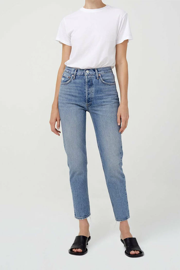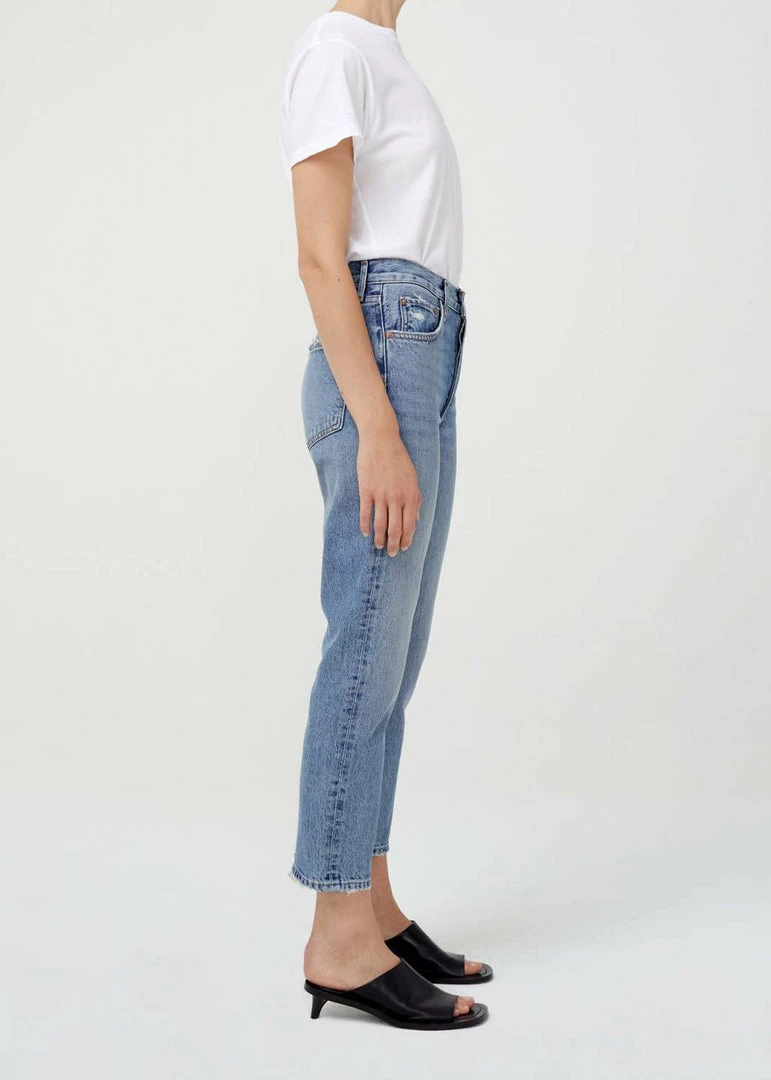 Riley hi rise, straight crop in endless blue by Agolde. The perfect medium light blue clean wash with the perfect hi rise, and straight leg. Slight distressing at back hem. Button fly.
