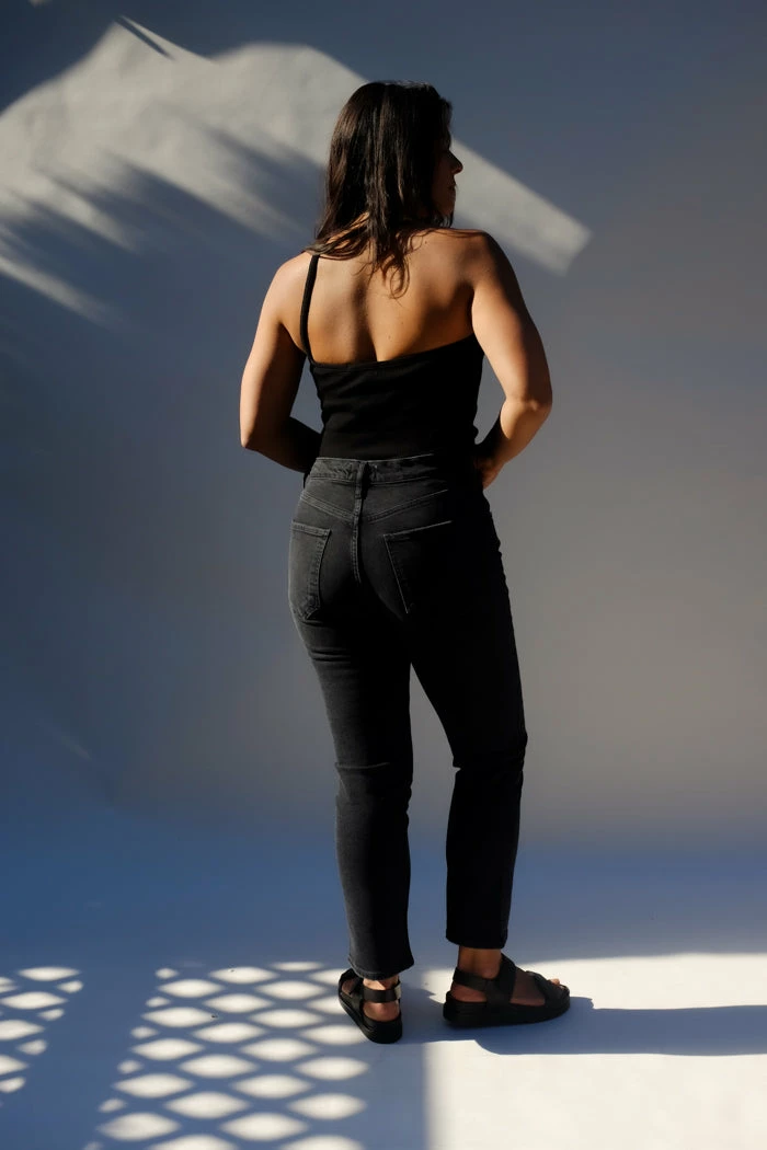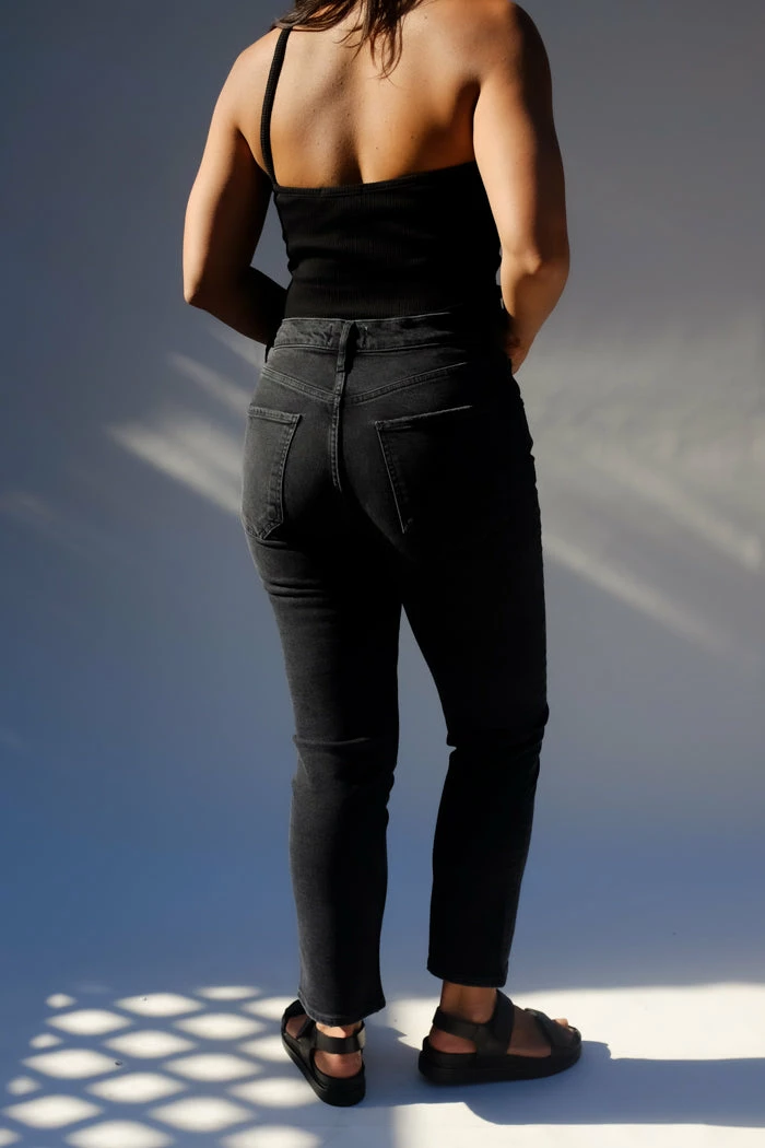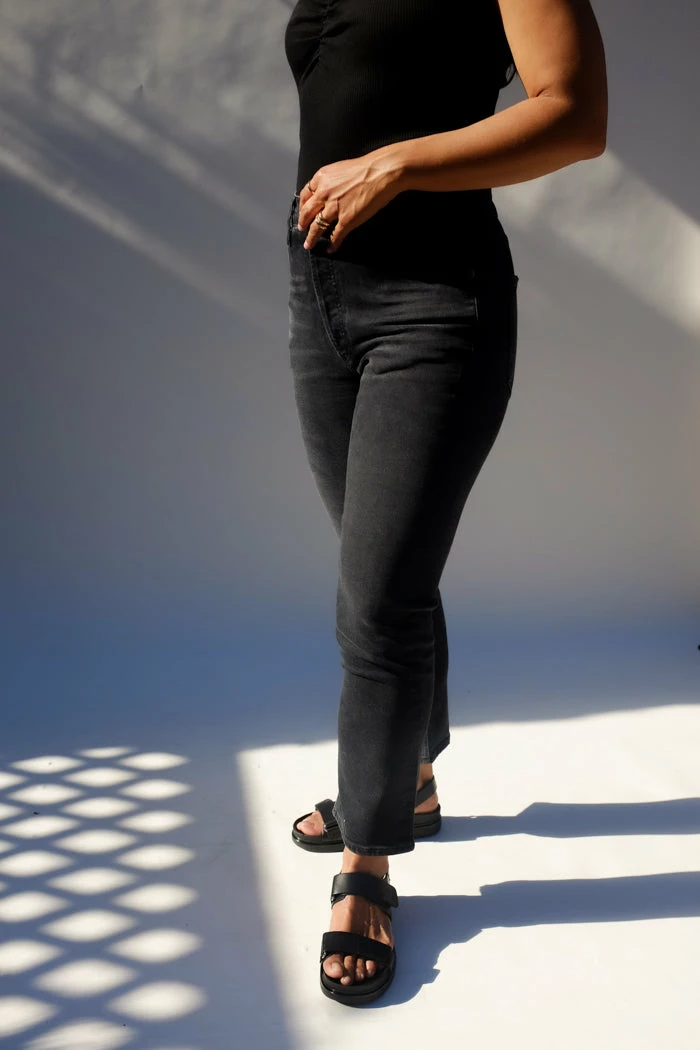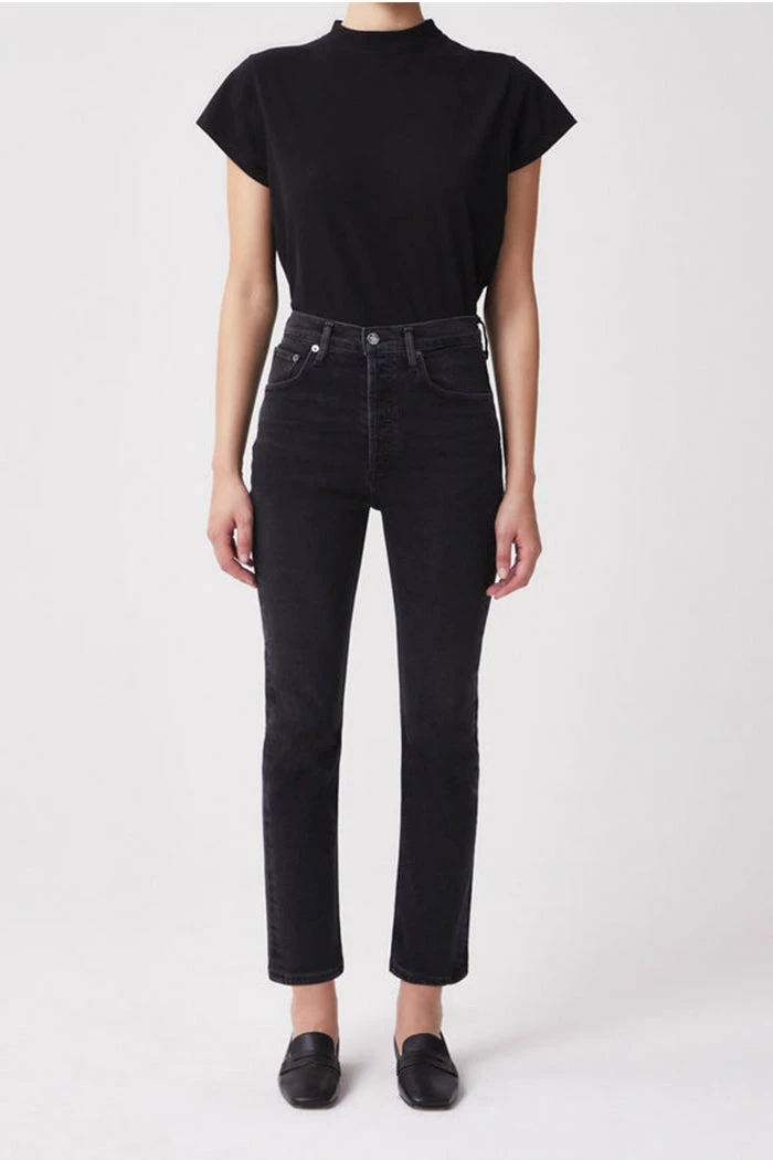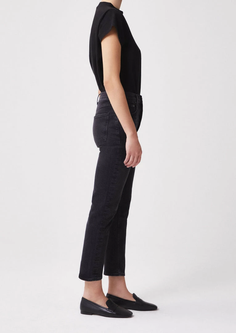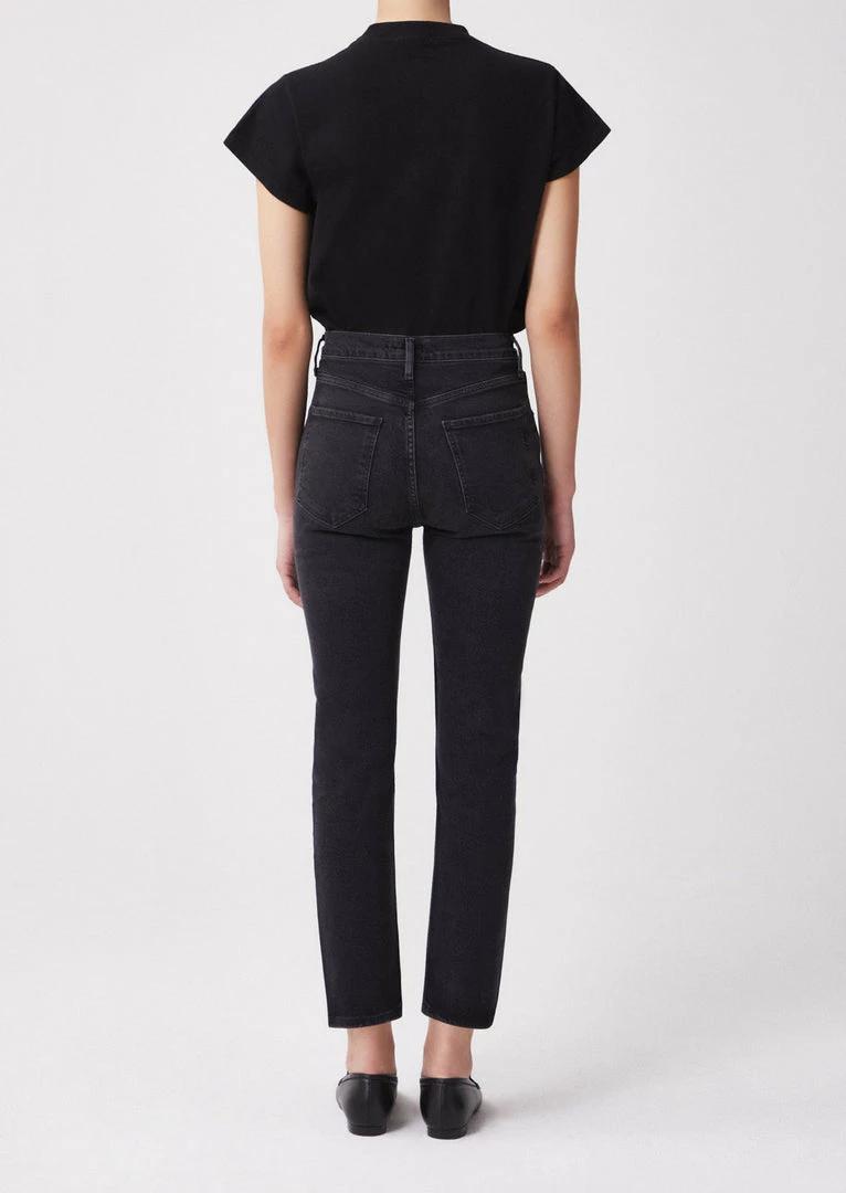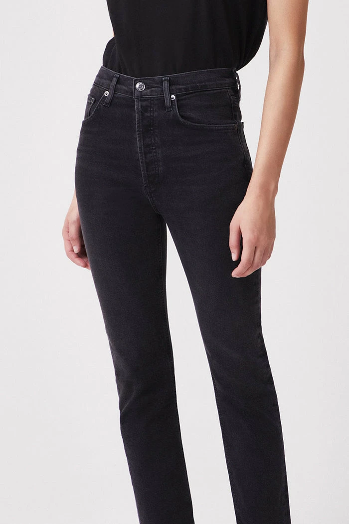 Agolde Riley high waist, comfort stretch washed black Panoramic straight leg jeans. High rise, slim straight leg, sits close to the body with a cropped inseam. Comfort stretch. Button fly closure.