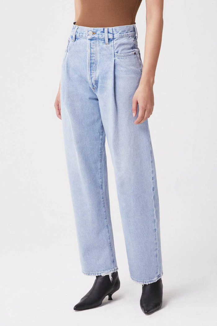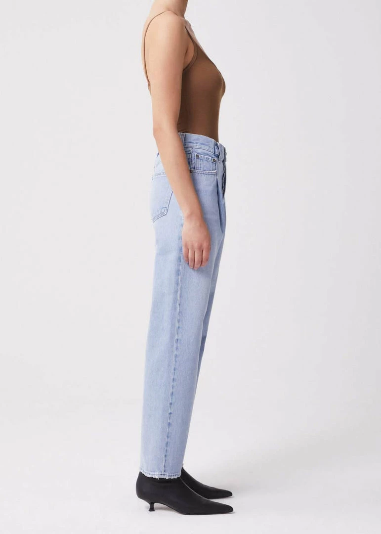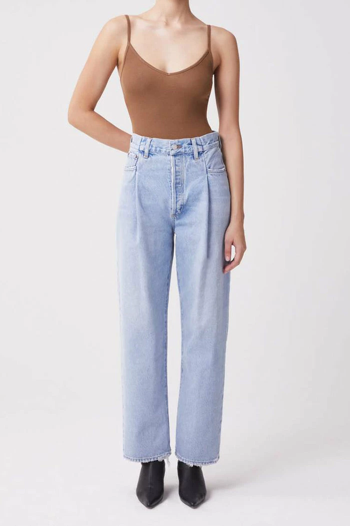 Agolde Folded Waistband straight leg jeans in light blue sideline wash. Thoughtfully placed fold details add dimension to this relaxed, easy straight leg. Crafted with a reconstructed waist band, the high-rise pair styles well with a tucked in tee or tank. Zip fly.