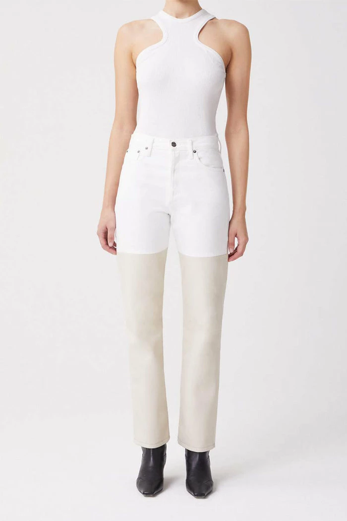 Agolde pieced 90’s pinch waist jeans in white denim top and powder cream recycled leather. This leather and denim vintage-inspired straight sits neat at the true waist with a close-fitting top, finished with an easy leg. Non-stretch, soft denim/buttery soft luxe leather.