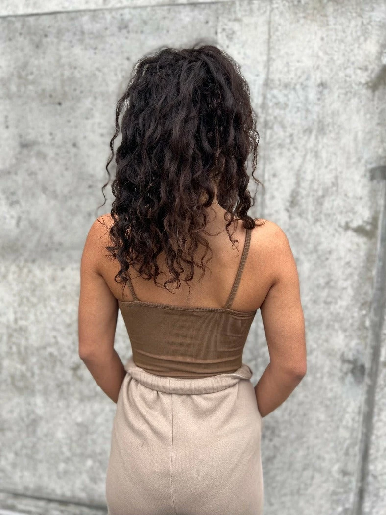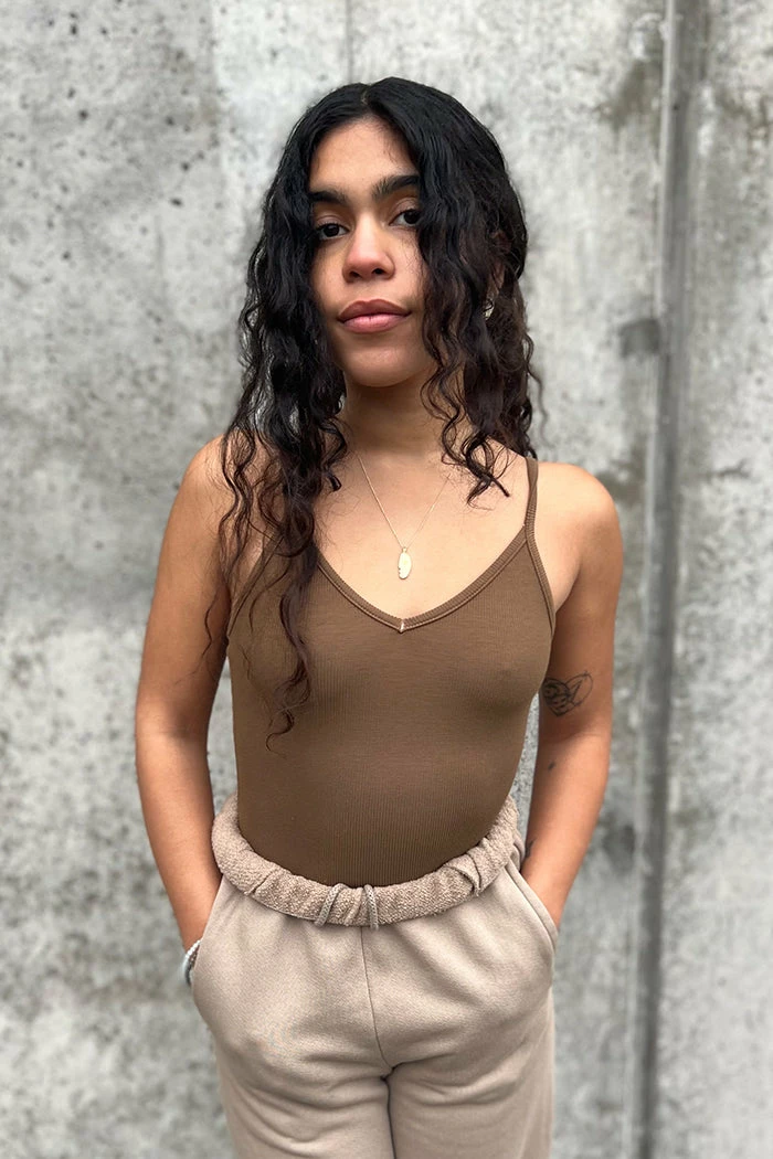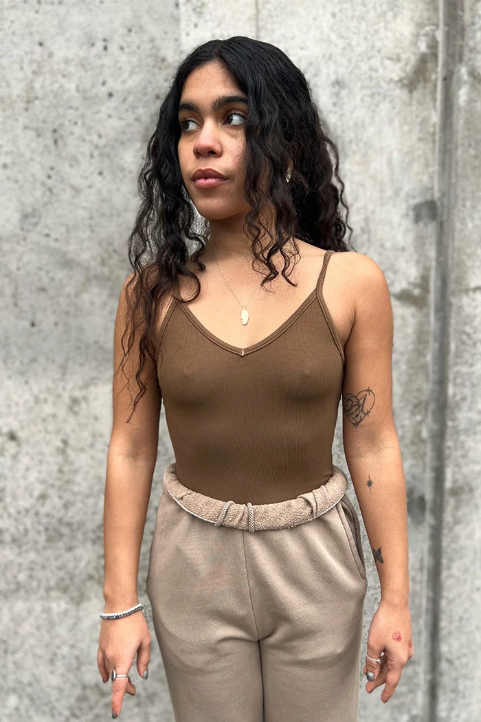 Agolde spaghetti strap v neck bodysuit in ribbed toffee brown.