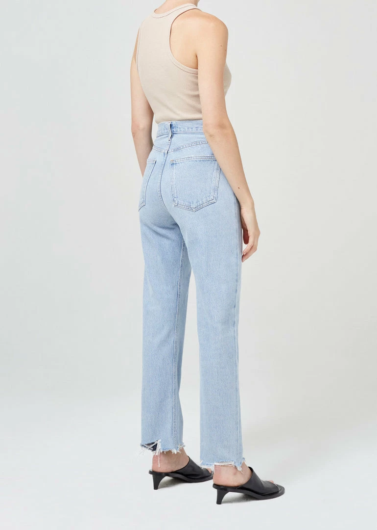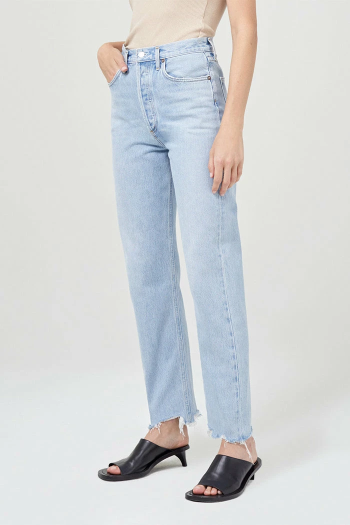 Agolde 90’s pinch waist, high rise in light blue Imitate wash. The 90’s Pinch Waist is a vintage inspired straight. This pair sits neat at the true waist with a close-fitting top block and easy leg. Raw hem and button fly.