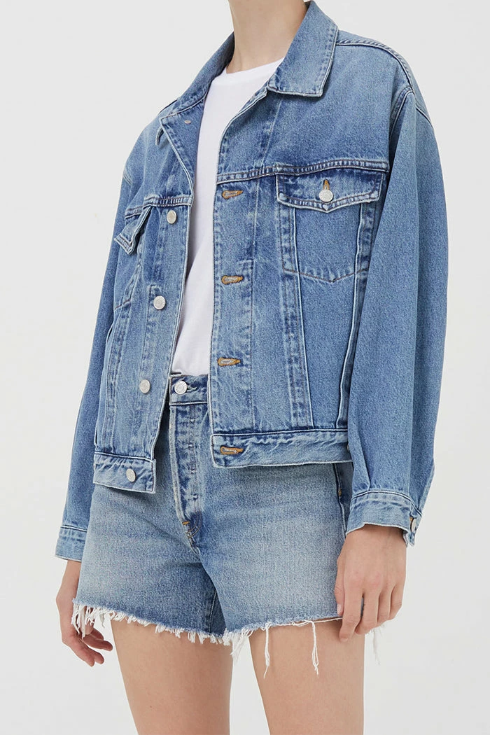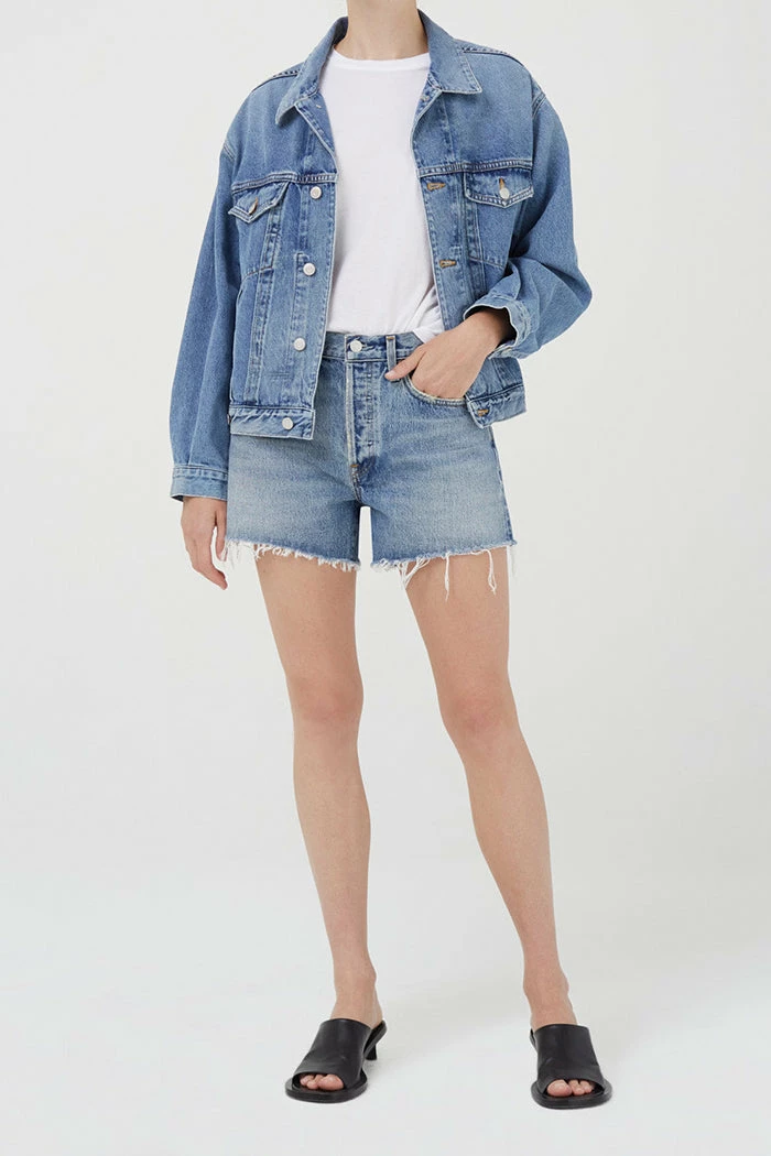 Agolde Charli oversized denim jacket in medium vintage debate wash. The dropped shoulder and slouchy silhouette give this fit a super relaxed feel. Made from non-stretch denim in a vintage-inspired indigo.