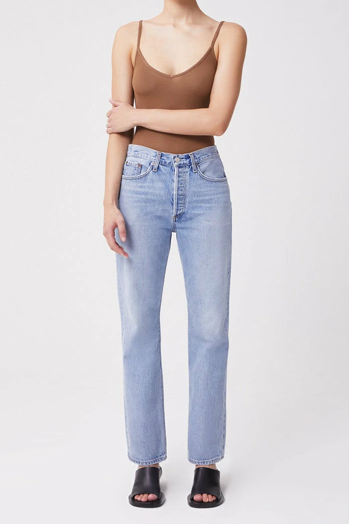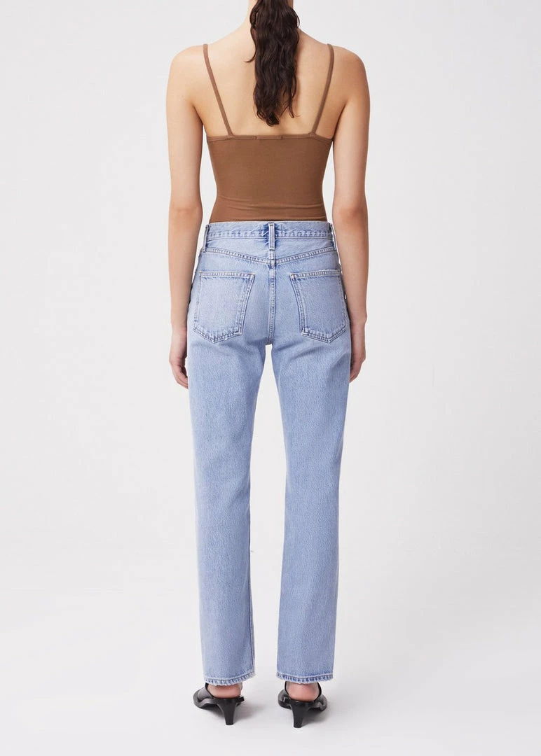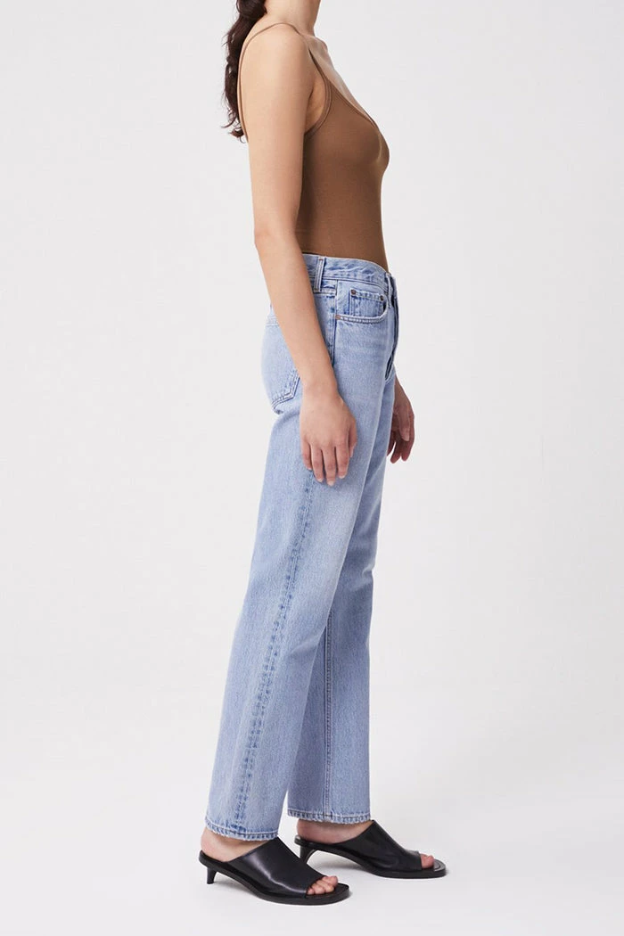 Agolde Lana straight leg jeans in fiction clean light blue. True straight silhouette with a mid rise and full length inseam. Non-stretch, button closure.Â