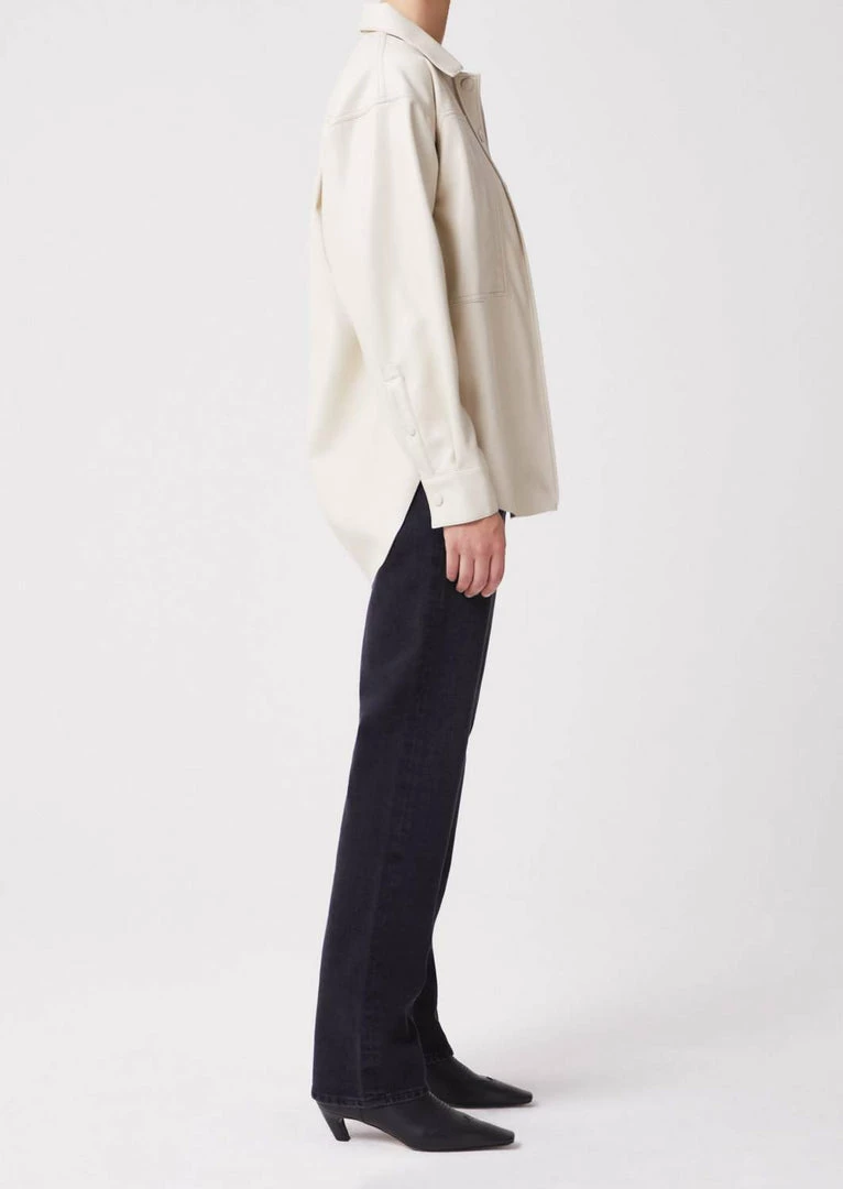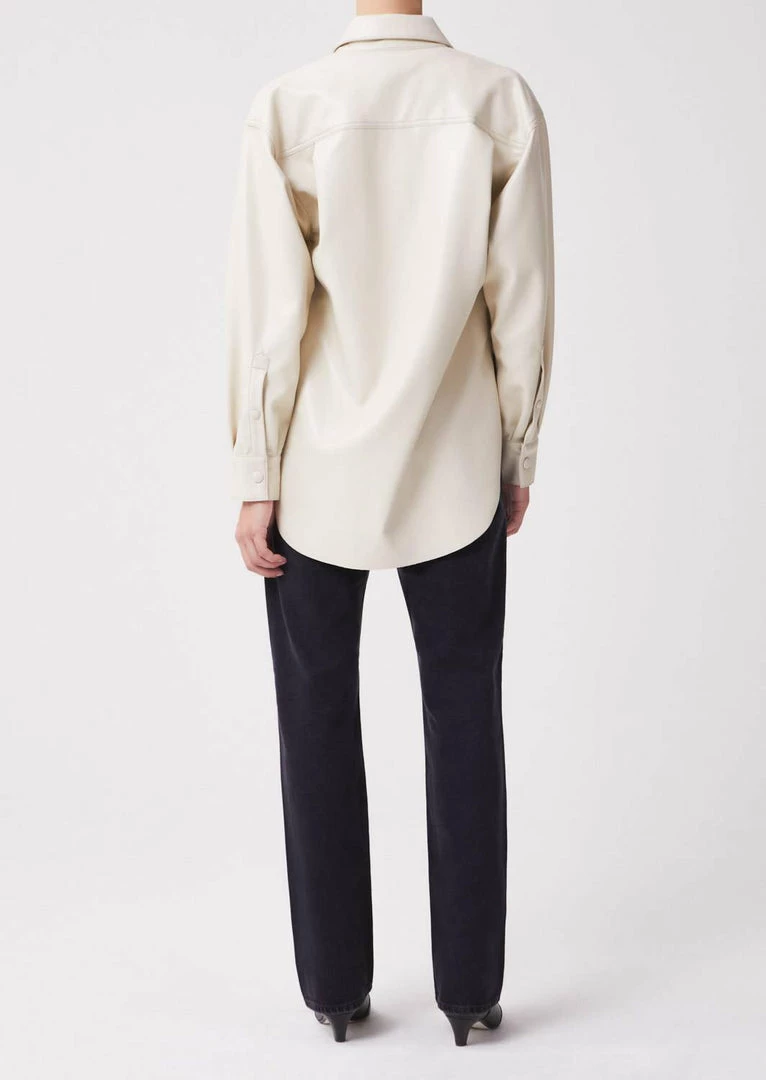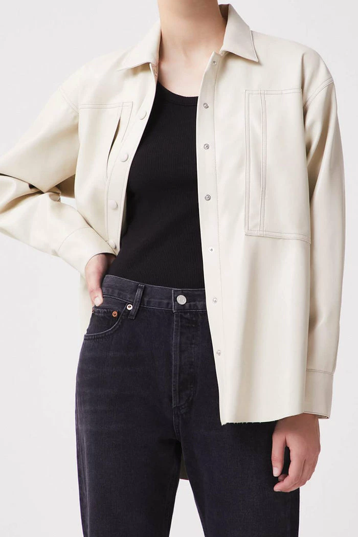 Agolde Utility vegan leather shirt in powder. Luxe matte powder white vegan leather with buttery hand feel and gentle drpae. Cut with an oversized silhouette in our smooth vegan leather, the Utility shirt has a pointed collar, oversized pockets and snap front closures and cuffs. Layer over a classic t-shirt or pair with tonal leather for a head-to-toe look.