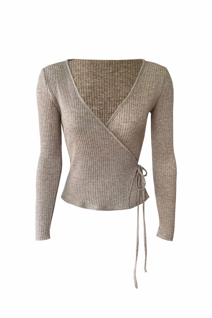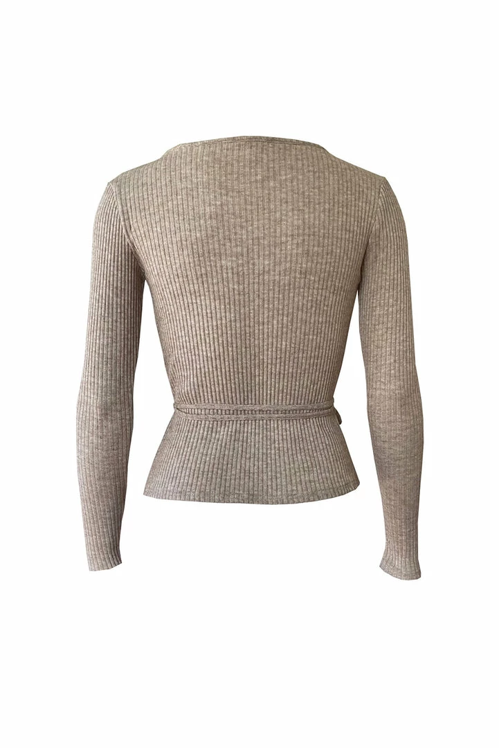 Angie Bauer versatile ribbed knit ballet wrap sweater top that can be tied around the waist or at the side. The perfect casual sweater for layering or worn alone as a top. Made of a soft, lightweight sweater knit.