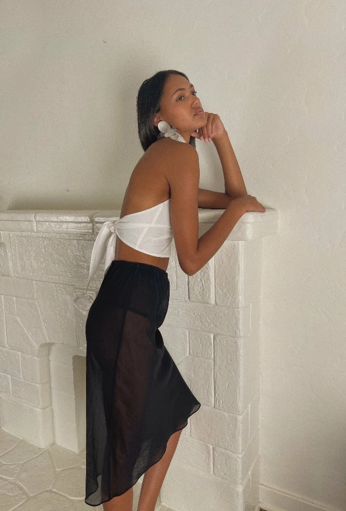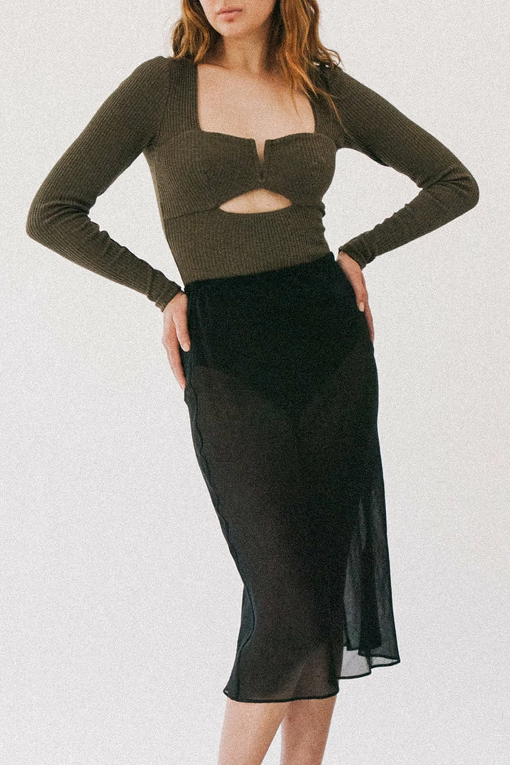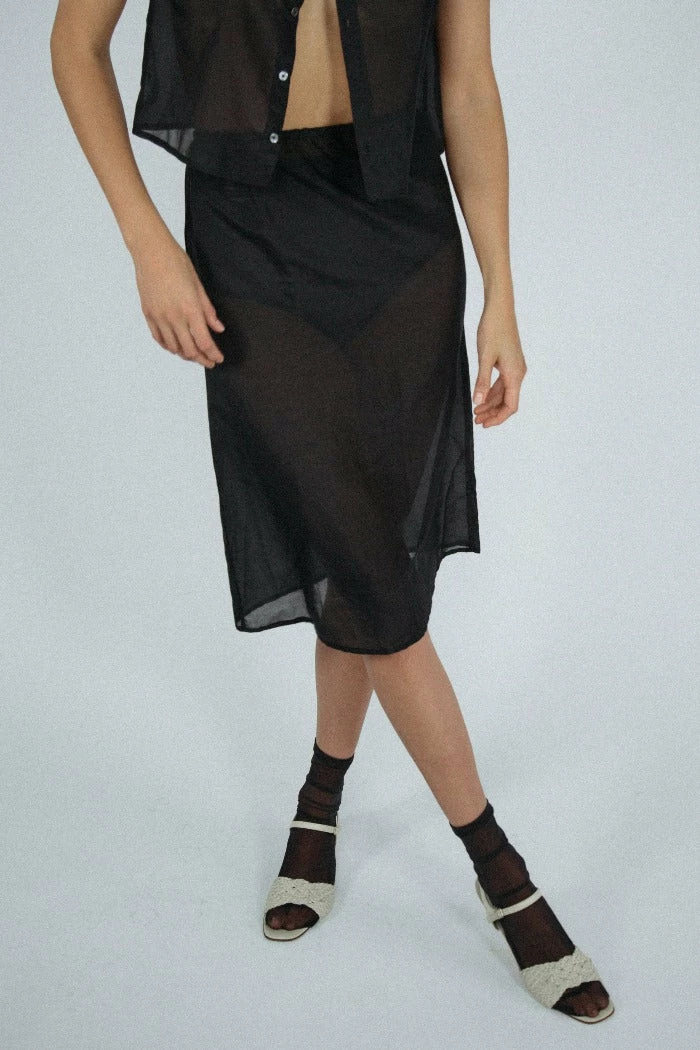 Angie Bauer Carly sheer high rise silk-cotton bias cut midi skirt with an elastic waistband in black.Â