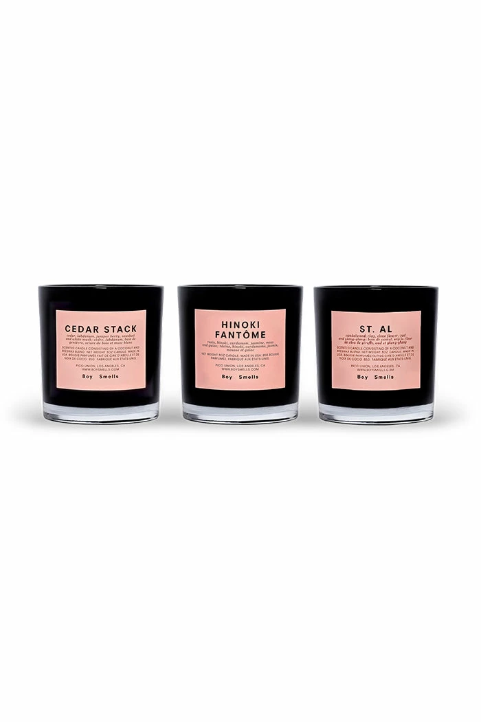 Boy Smells woody votive trio cedar stack, hinoki fantome, st al. A votive variety pack of three candles; petite versions of the standard 8.5oz candles. This set is made for wood lovers, featuring warm, vibrant woody favorites—cedar, hinoki and sandalwood.Â