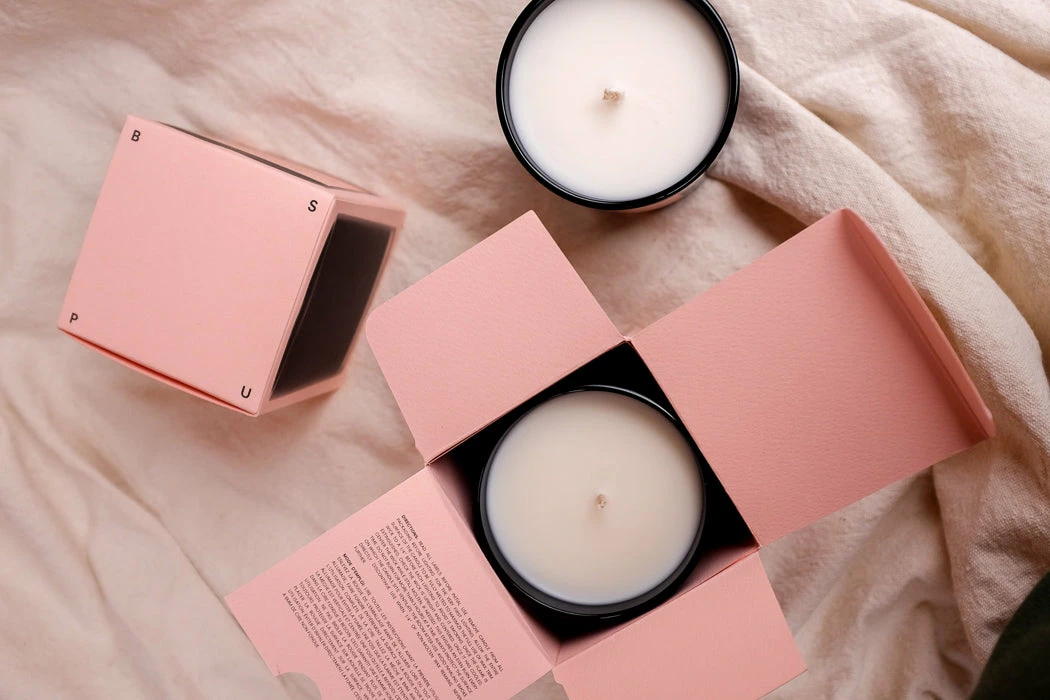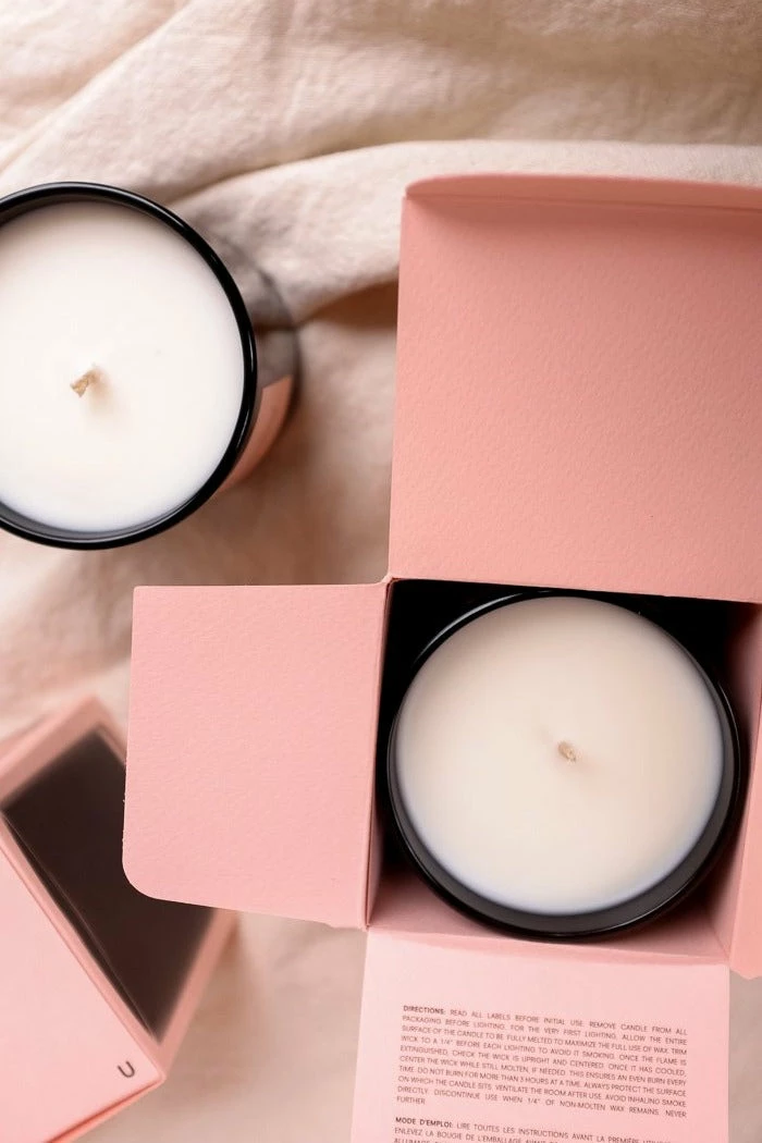 Coconut and beeswax with braided cotton wick, in glossy black glass tumbler. Comes in embossed matte pink carton.