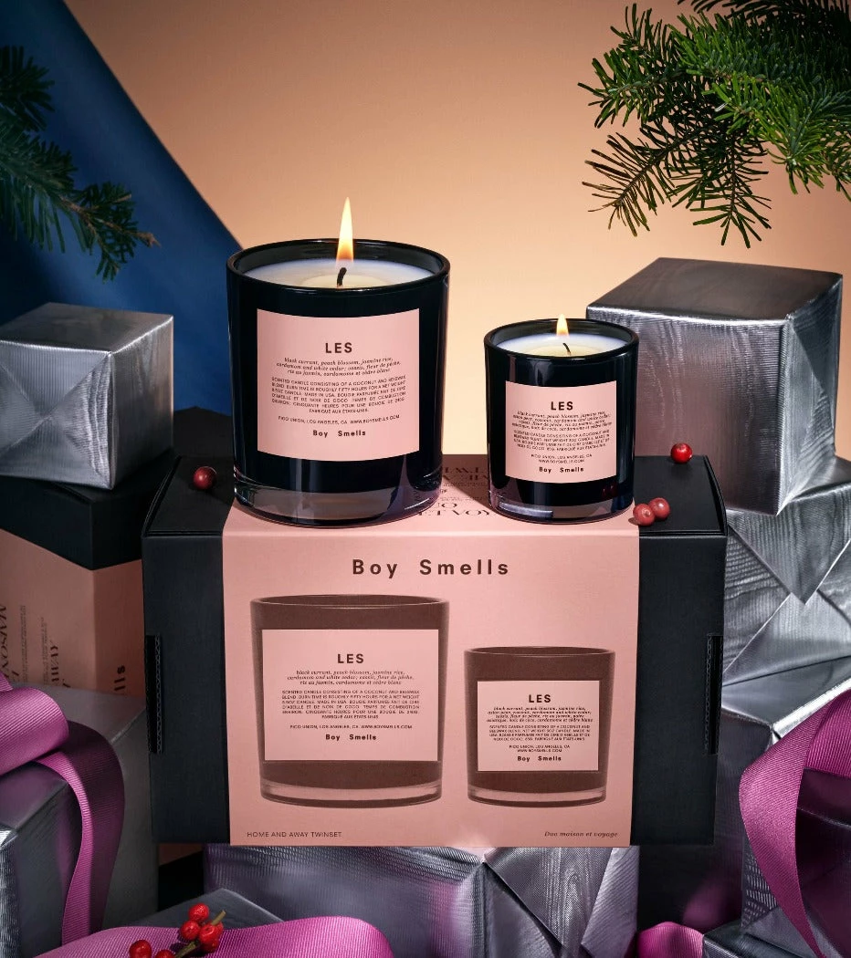 Boy Smells Home & Away LES candle gift set.  ​​Invigorate the space you’re in, be it at home or away somewhere. Presenting a highly giftable boxed set of your favorite smell that is perfect for the holidays, or for self-indulgence. This scented duo includes LES in both standard 8.5oz and 3oz votive sizes to make any space you’re in feel like home.