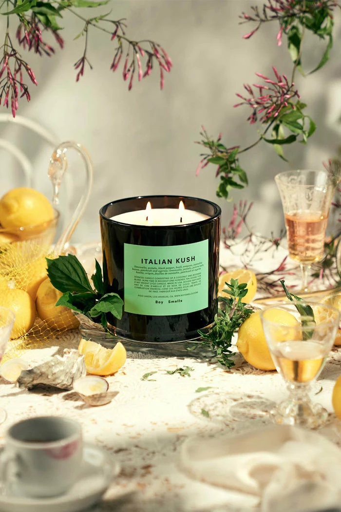 Boy Smells Italian Kush magnum candle. Takeoff to Italy in herbal opulence. A new strain of the classic Kush with hits of bright Italian citrus and black pepper sitting atop a heart of basil, oregano and fresh cannabis. Grounded in earthy base notes of patchouli and fresh cypress, this molto herbal scent is sure to make you say “Bellissimo!” And before you know it, you’re blissfully summering on a lush green lawn and looking up at an endless field of citrus groves.