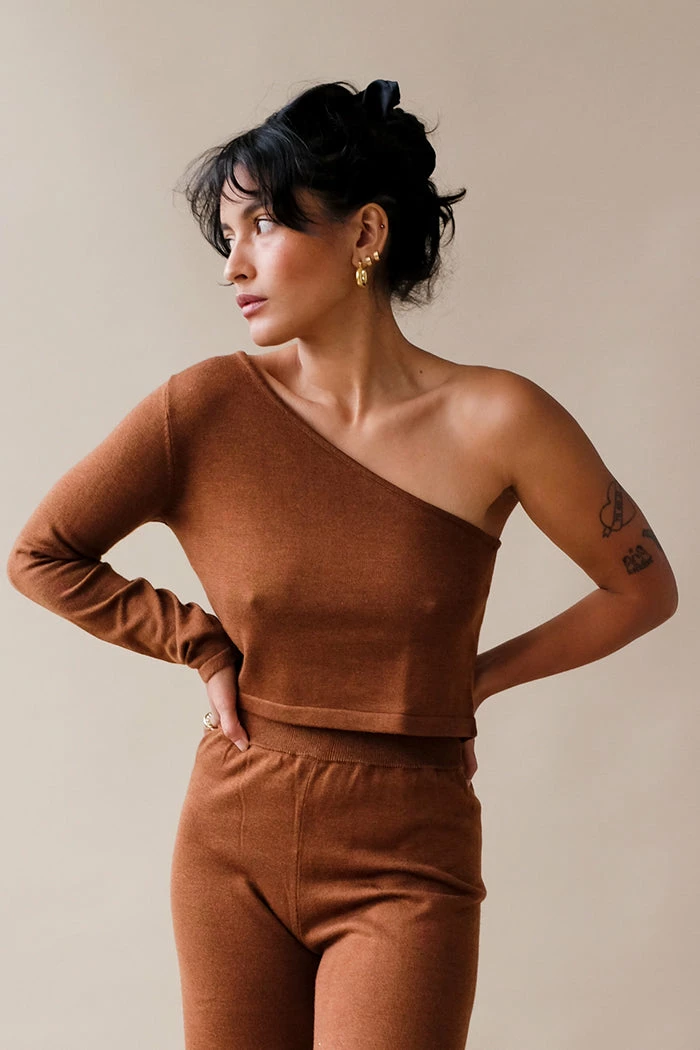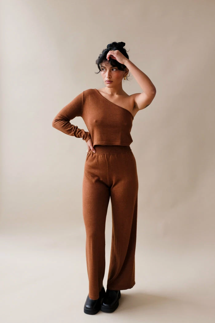 Callahan Lora long sleeve, knit, asymmetric top in root beer brown.