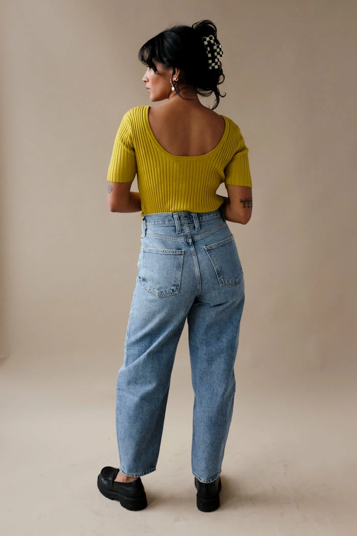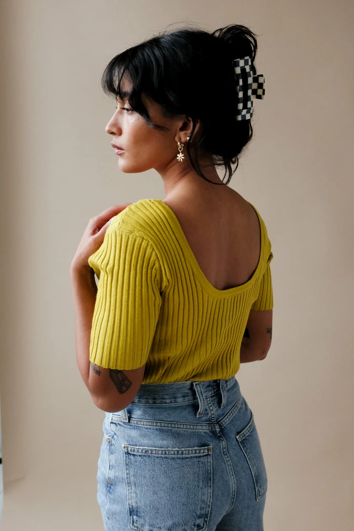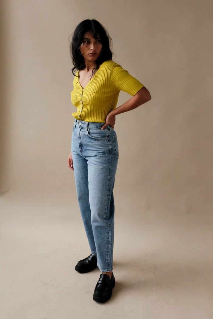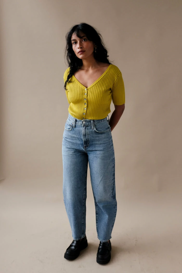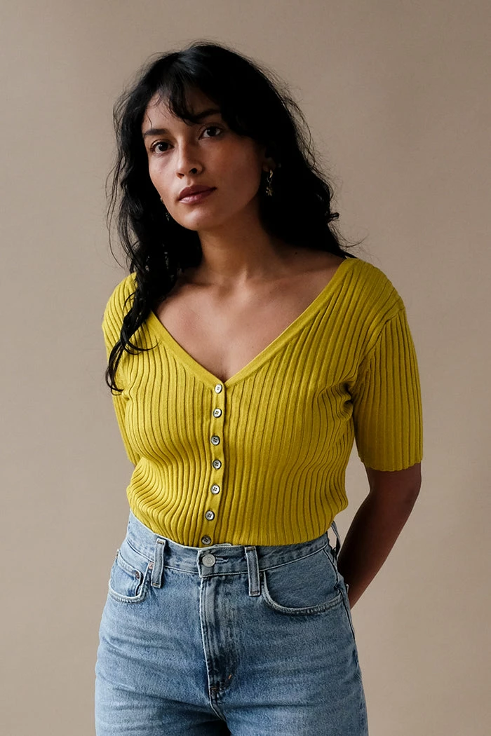 Callahan Connie ribbed button up cardigan top in dandelion yellow. Flattering ribbed knit with low v-cut.