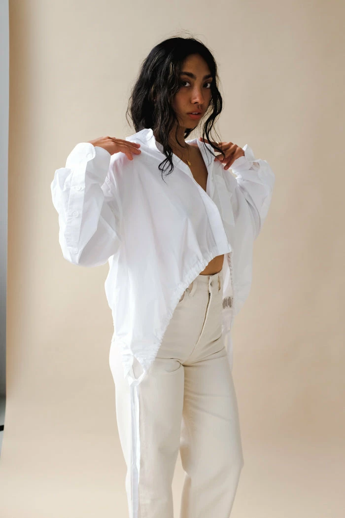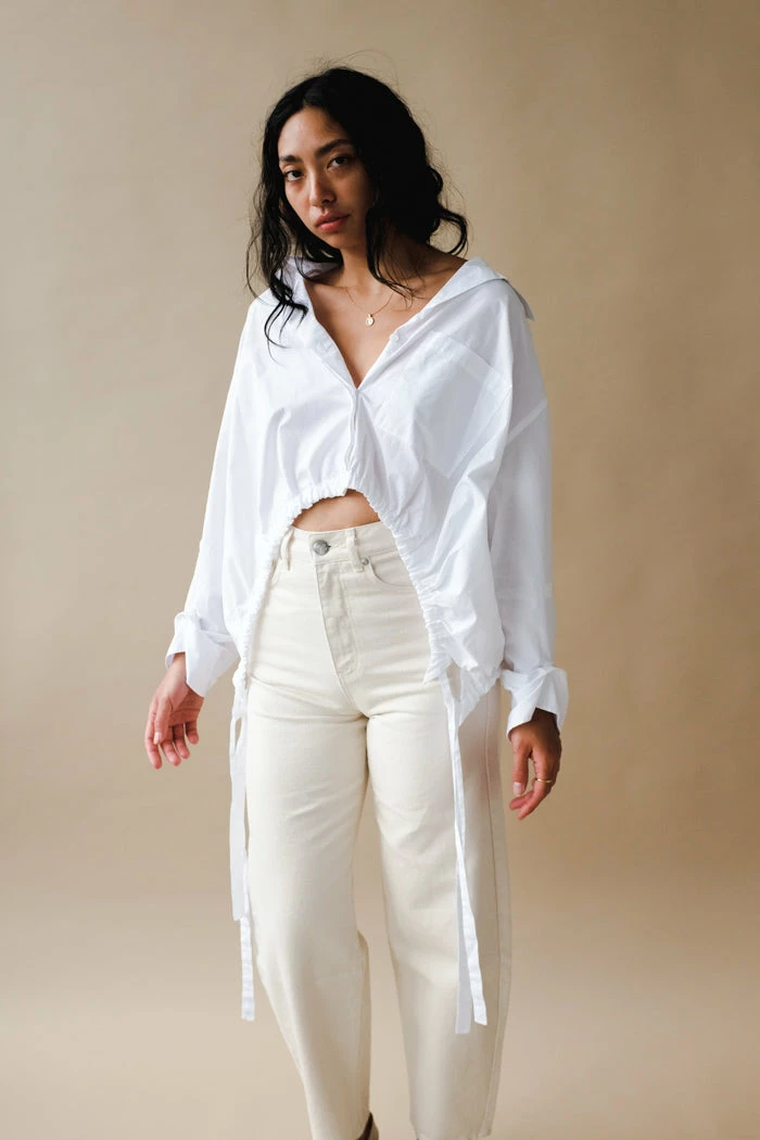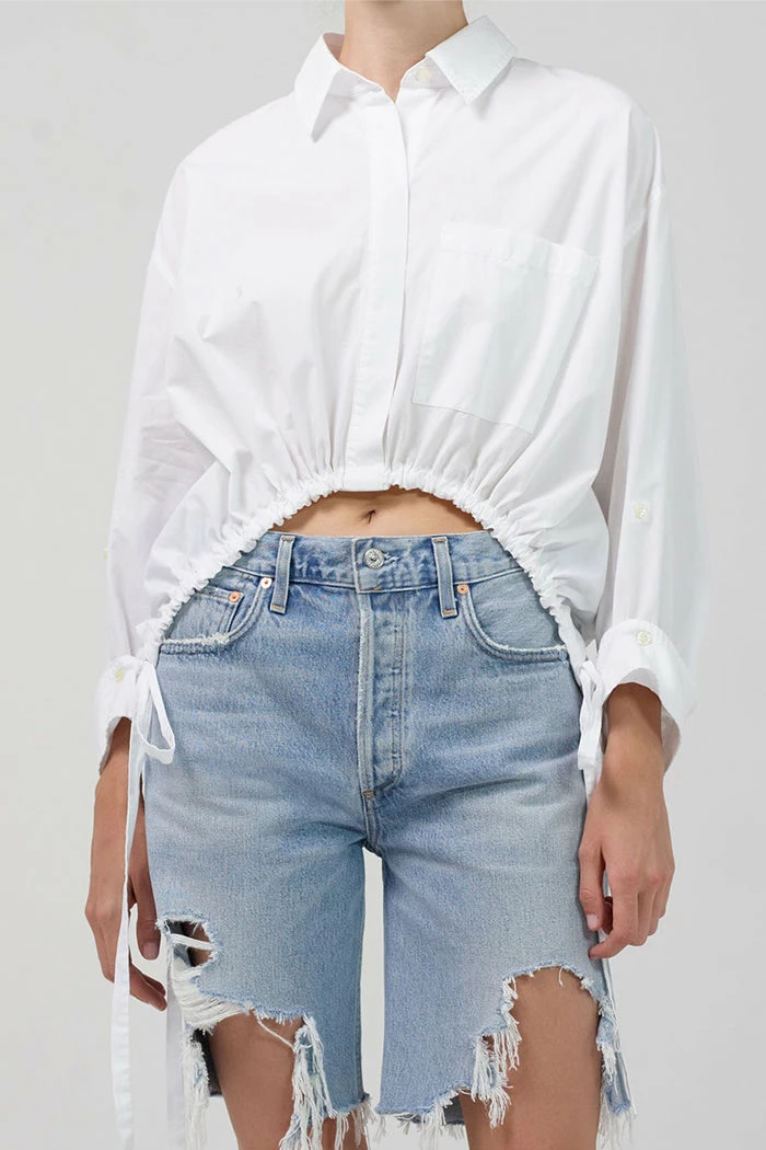 Citizens of Humanity Alexandra collared poplin button up shirt, with cinched drawstring tie hem in white. Relaxed, cropped fit. Single front patch pocket.Â