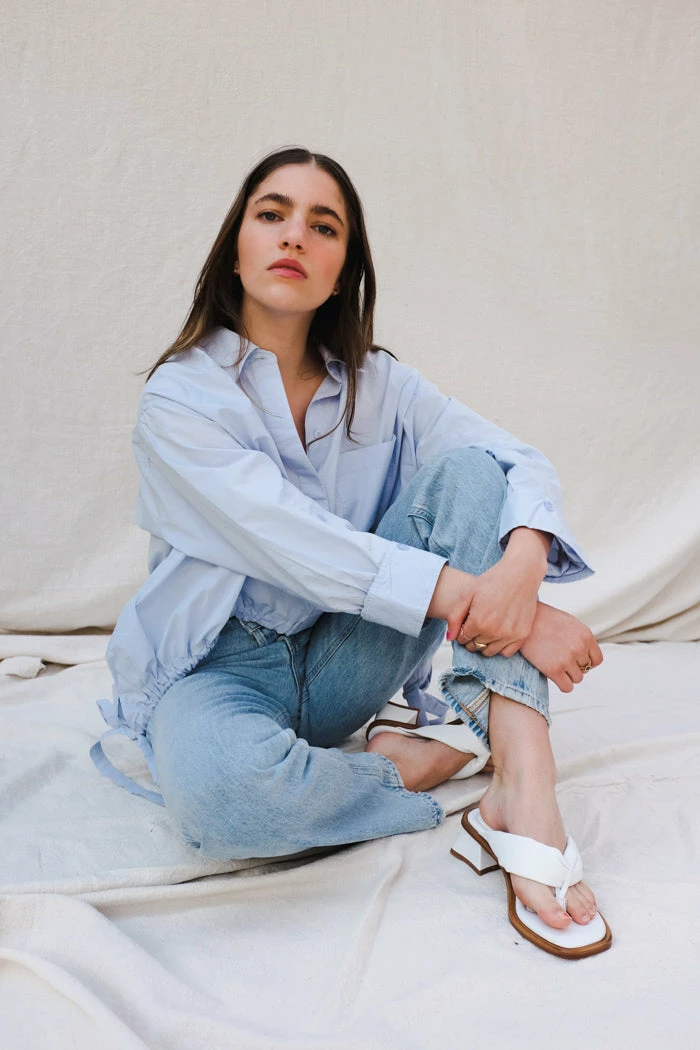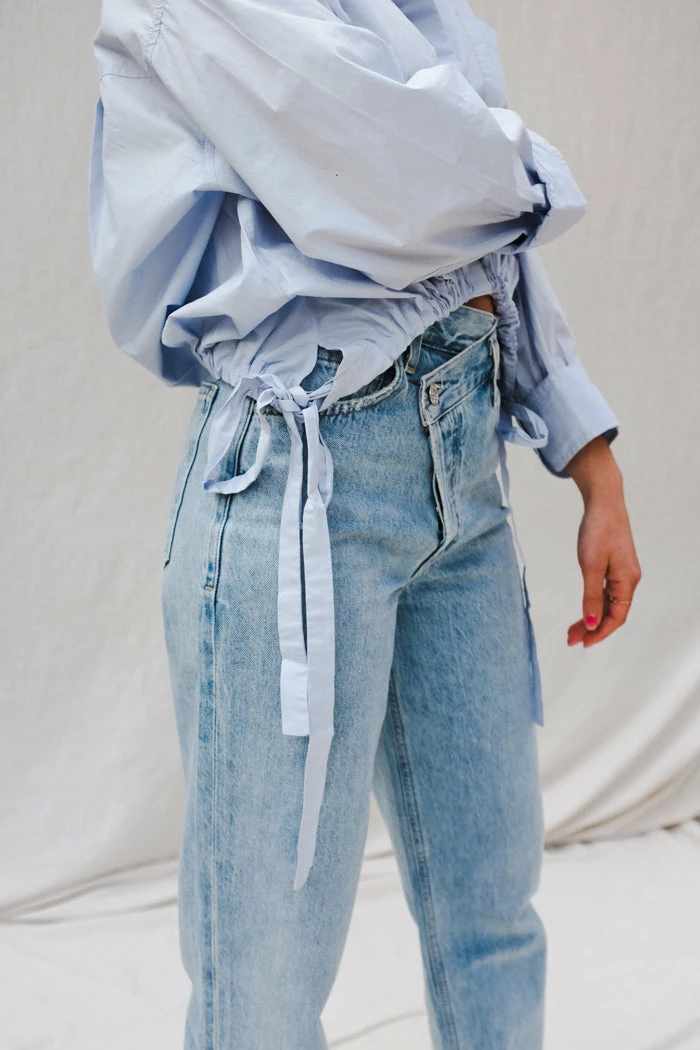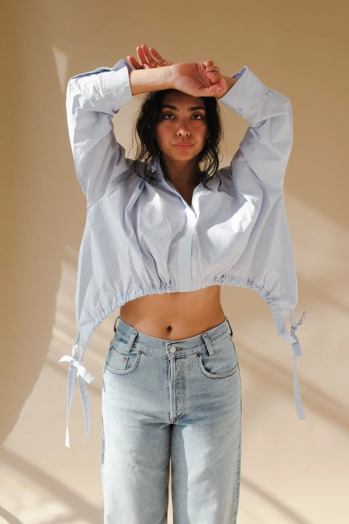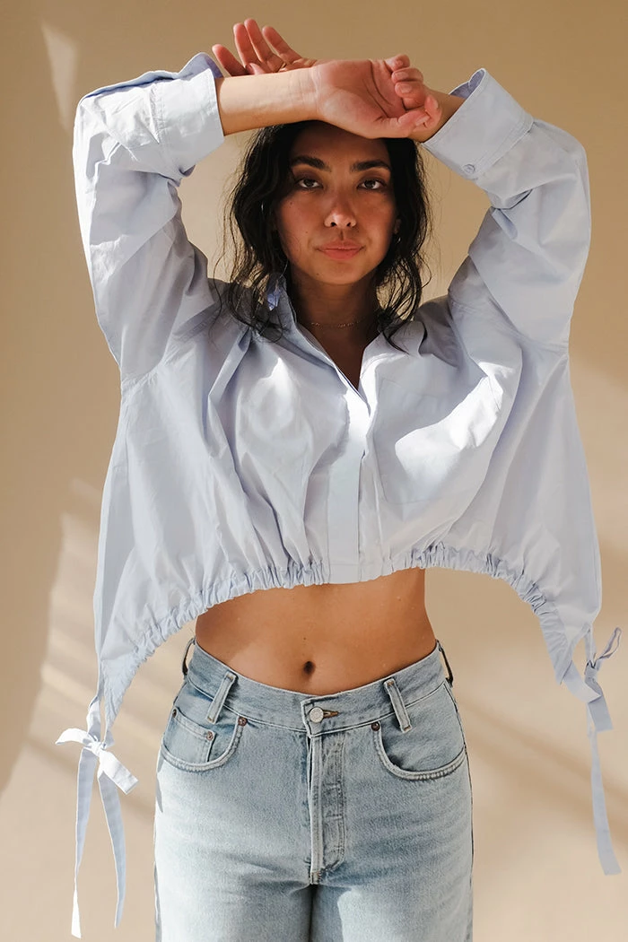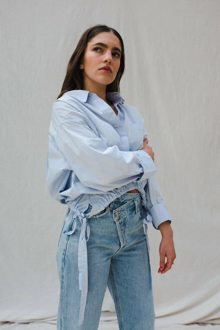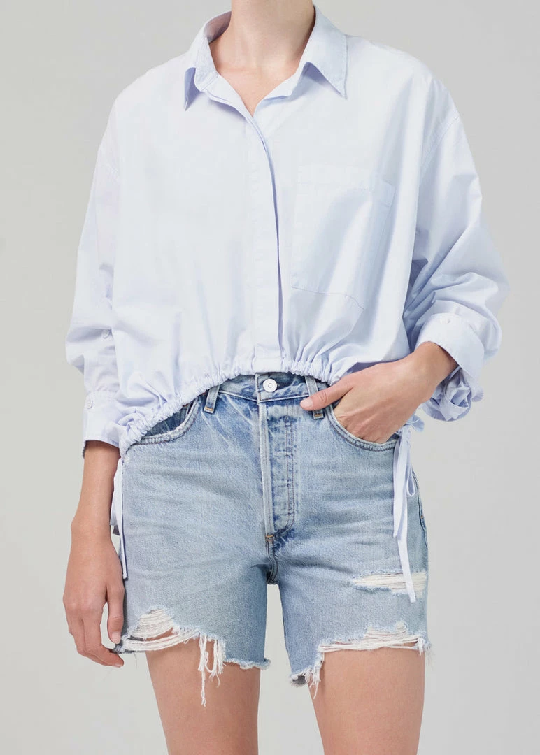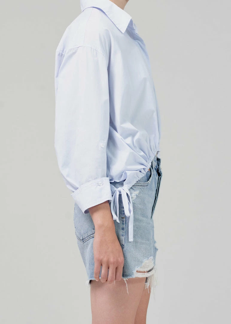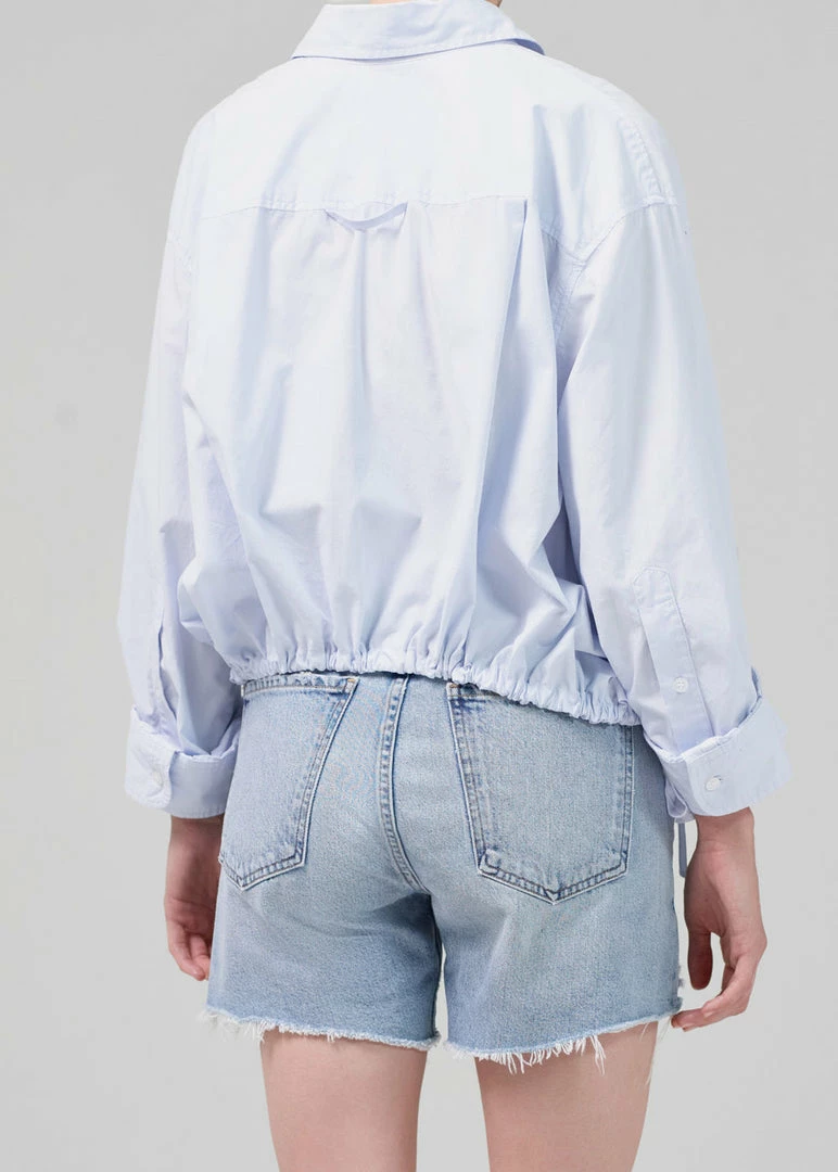 Citizens of Humanity Alexandra collared poplin button up shirt, with cinched drawstring tie hem in cruz blue. Relaxed, cropped fit. Single front patch pocket.Â