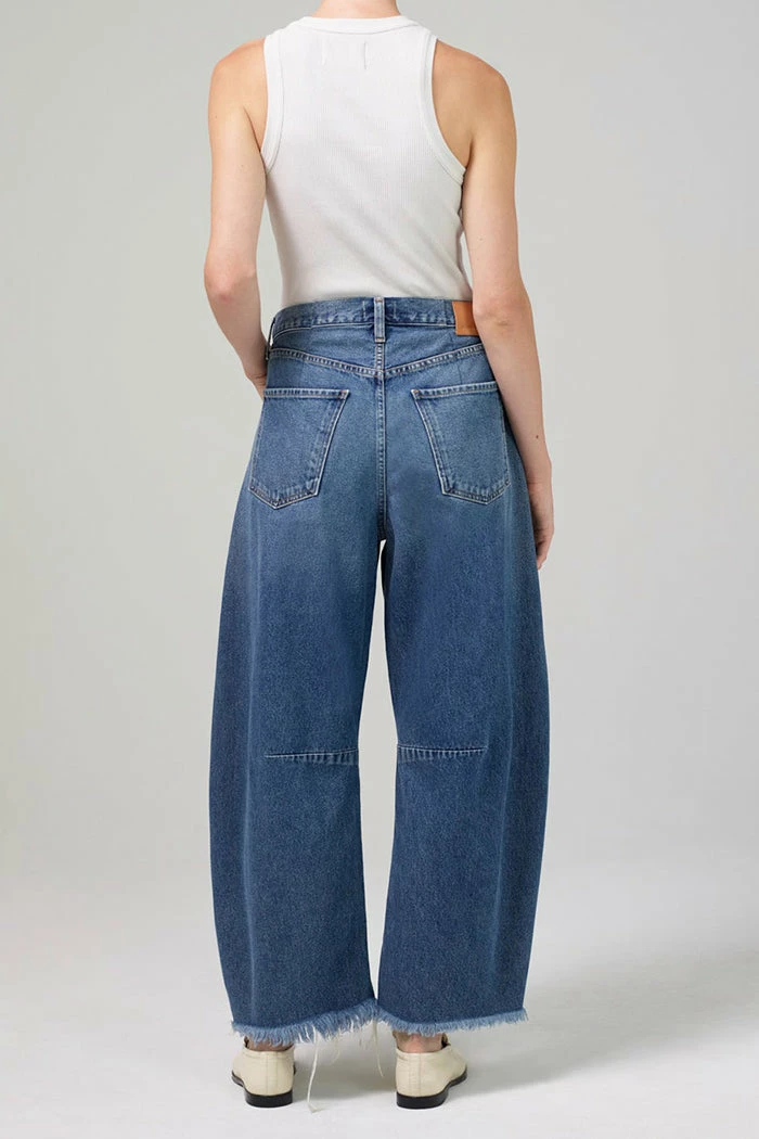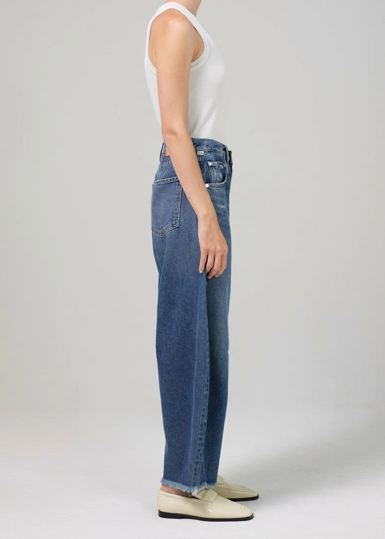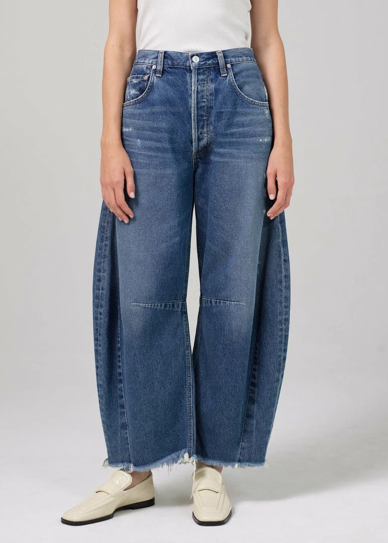 Citizens of Humanity Horseshoe jeans in vintage magnolia medium blue indigo wash. Aptly named, the Horseshoe jean is fashioned with a curved, wide leg that falls to slightly tapered and cropped, frayed hems. This oversized silhouette looks great with a sleek tank or our Brinkley Oxford. Non-stretch denim with authentic vintage character.Â