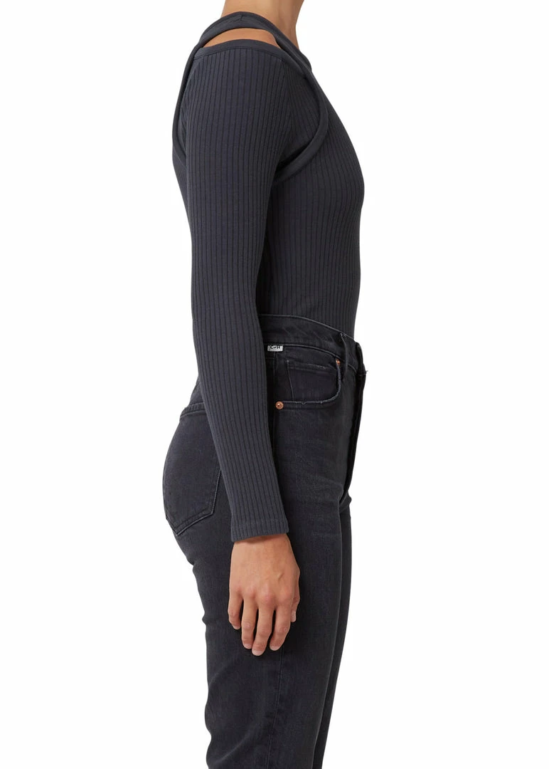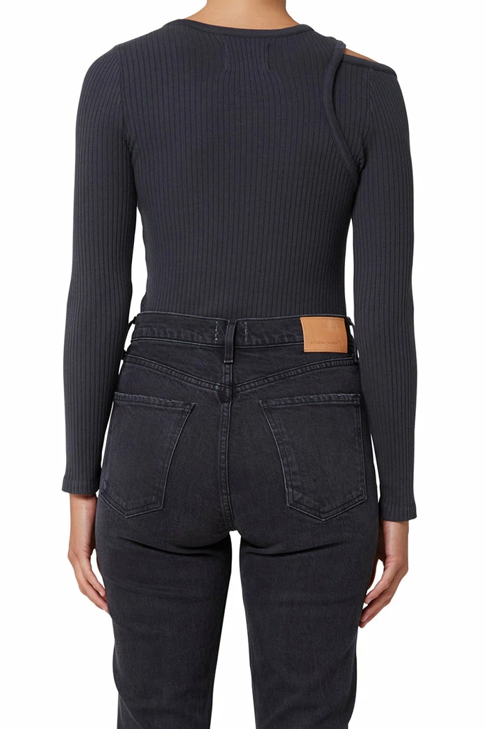 Citizens of Humanity Rianne cutout, long sleeve, ribbed, layered top in charcoal. This stretchy ribbed top has a cut out on one shoulder, that creates a modern asymmetric layered effect.