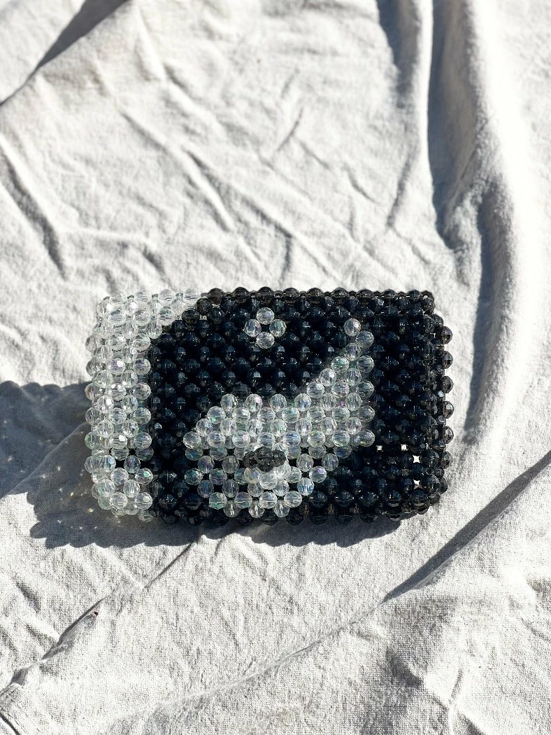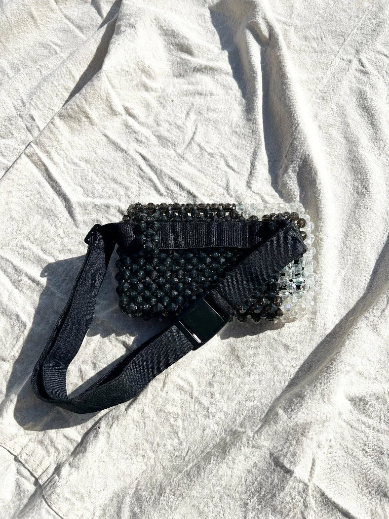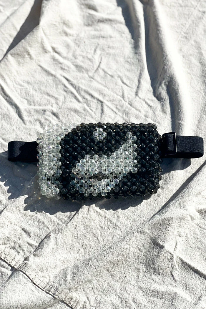 Feral No 9 hand beaded belt bag, fanny pack in black and white yin yang pattern. All the beaded goodness you love with the functionality of a belt bag to keep your hands free.