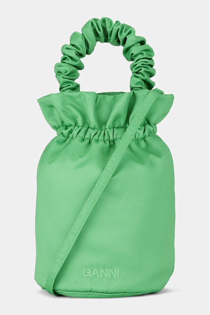 Ganni elegant mini pouch style occasion bag in heavyweight satin kelly green. Handheld style with the ruched top handle strap, or wear long with removable crossbody strap. No closure.