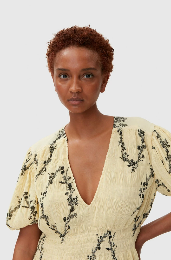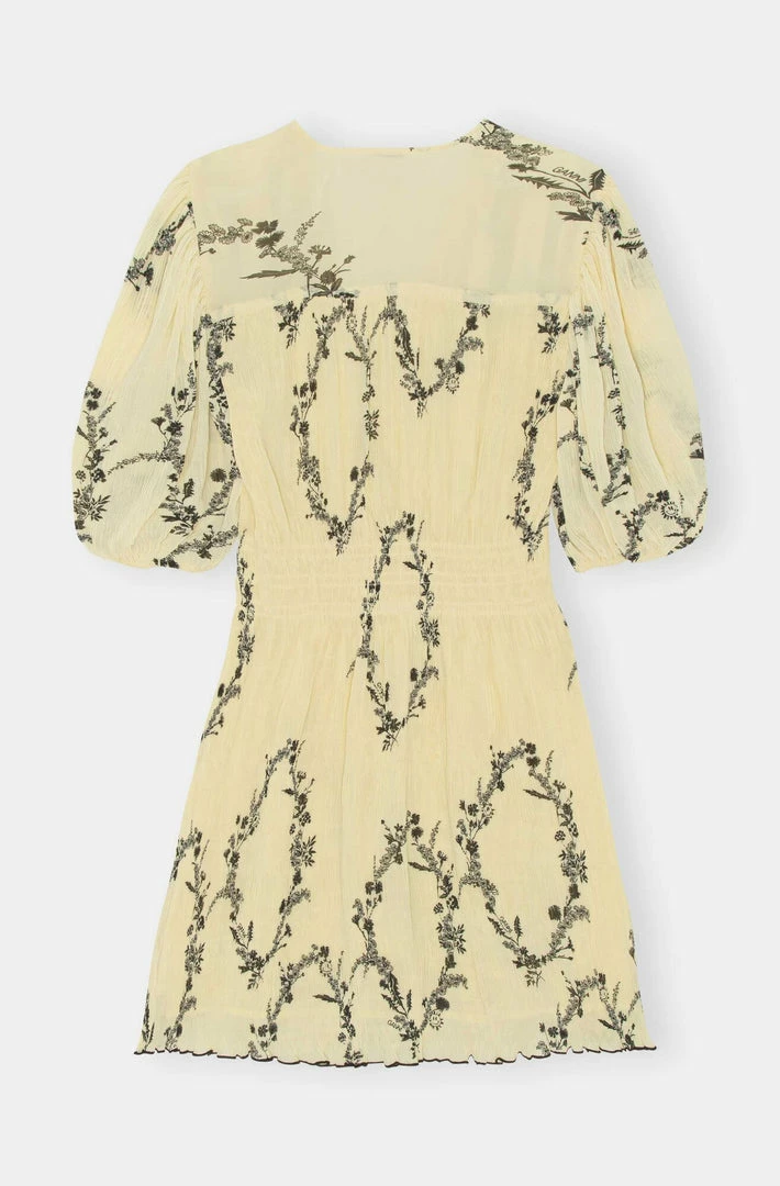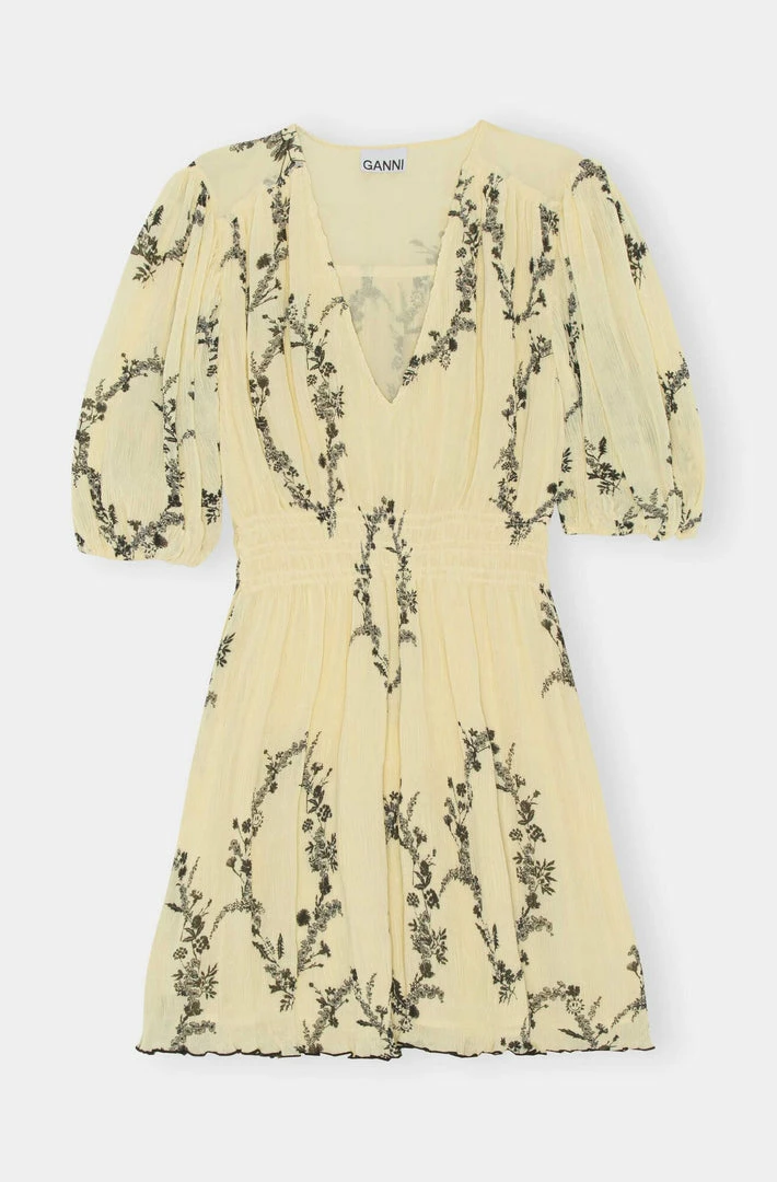 Ganni pleated georgette mini dress. Featuring a v-neckline and short elasticated puff sleeves. Cut for a relaxed fit with an elasticated waistband for a slightly defined waist. Designed for a close fit over the shoulders, cut straight from the chest. Lightweight, fluid georgette fabric with mini accordion pleats and contrasting piping on most hems. Slip-on style, no closure. Lined and slightly sheer.