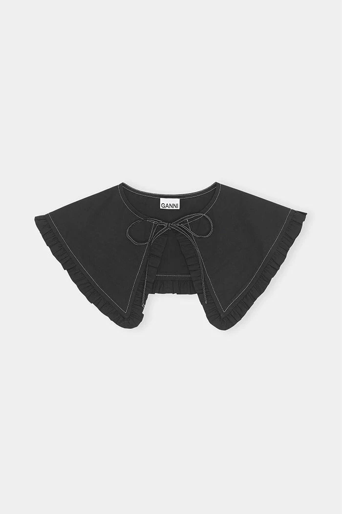 Ganni black detached cotton poplin collar with white contrast stitching, finished with a front tie detail and ruffled edge. Somewhat oversized in a pointed silhouette.