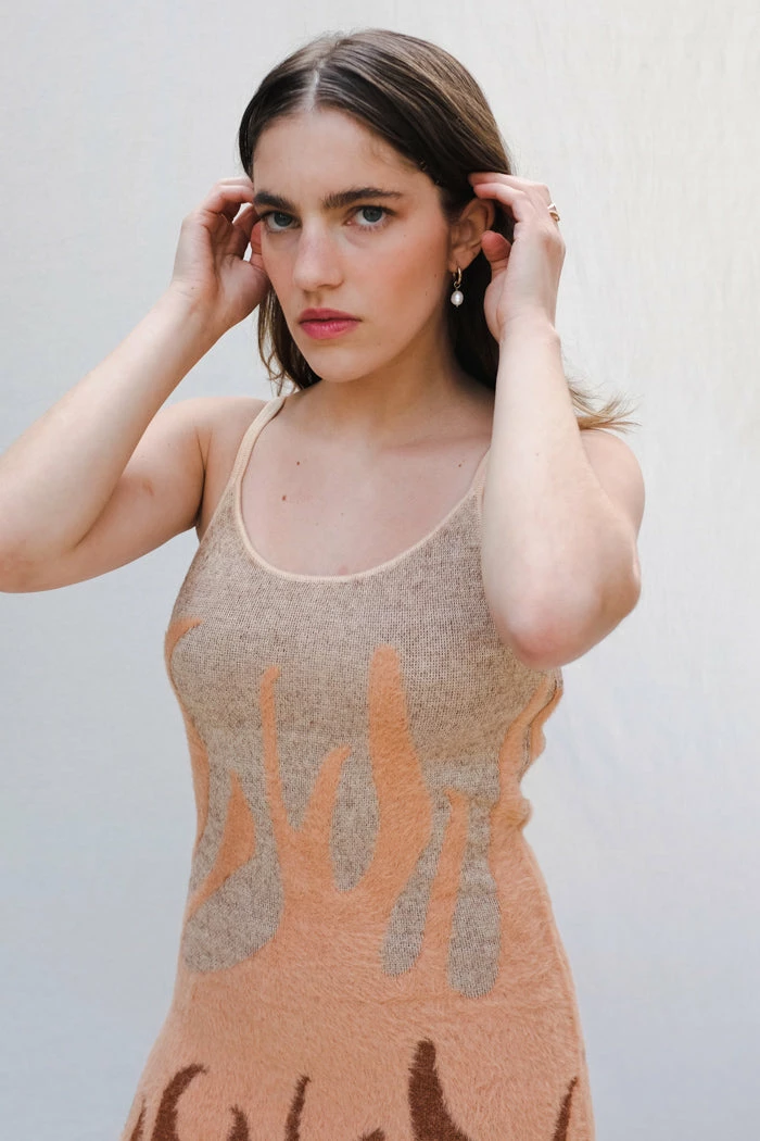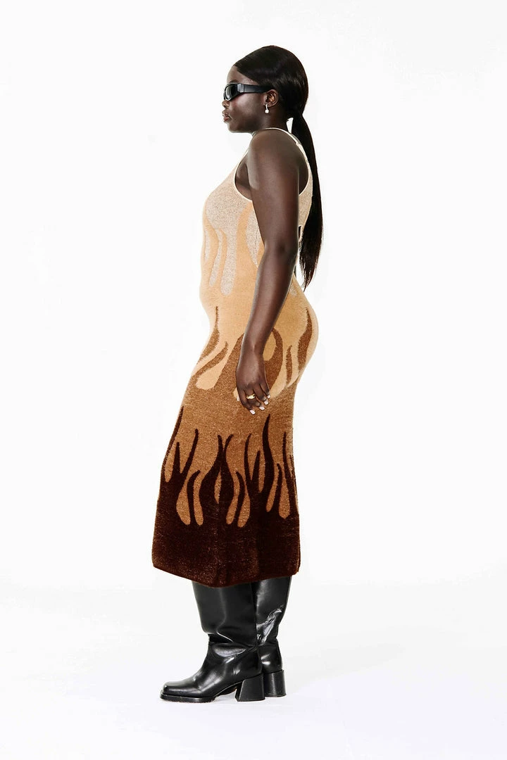 House of Sunny Hotel California textured knit hockney dress with flame pattern.