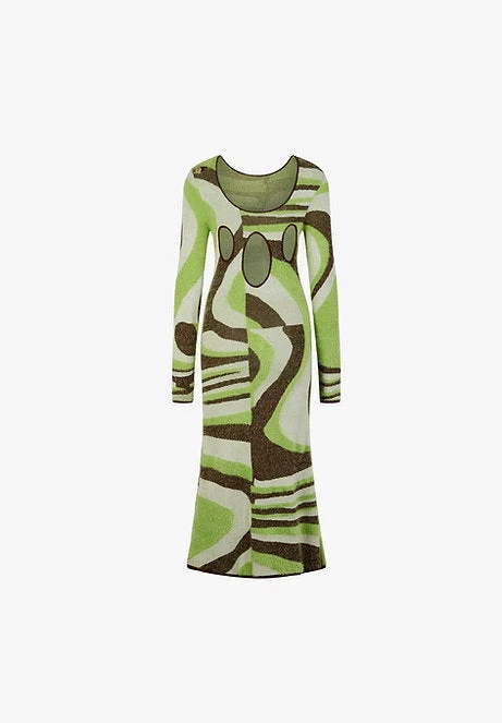 House of Sunny Land Cruise long sleeve knit hockney dress. A long-sleeved twist on the iconic Hockney Dress, round neckline, form-fitting, slip-like silhouette and midi length. In a fuzzy knit with a green and chocolate toned wavy print that alternates between a smooth and fluffy touch, much like jacquard. Captivating oval cut-outs at the back add a touch of drama.