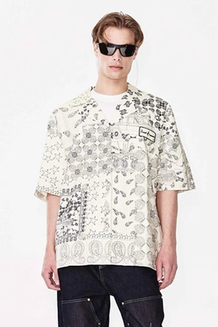 House of Sunny button up oversized Roadie shirt with brown printed paisley block print.