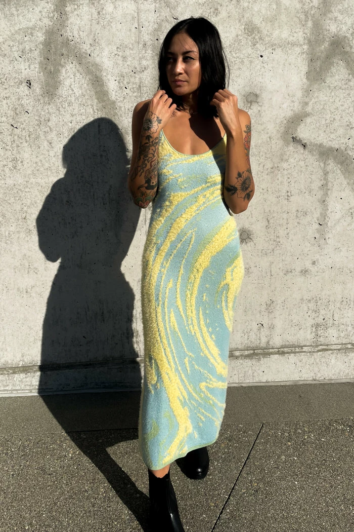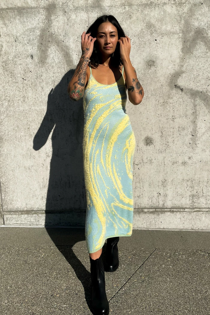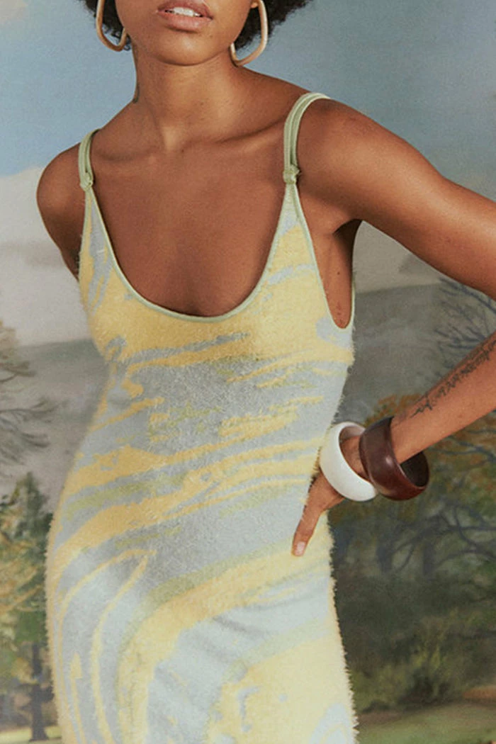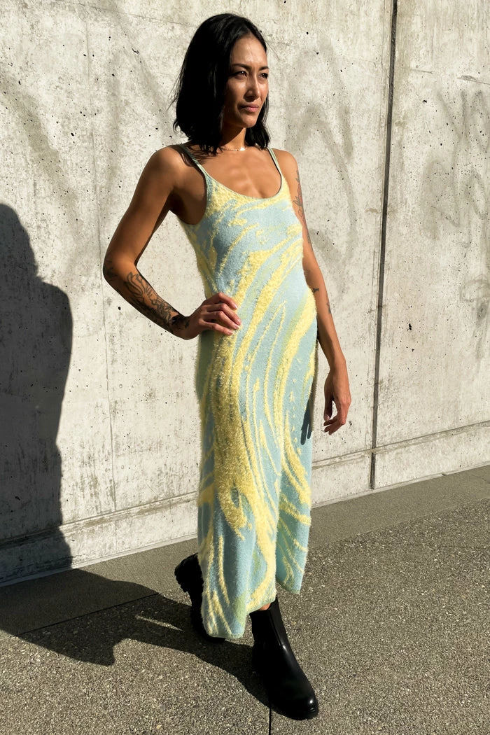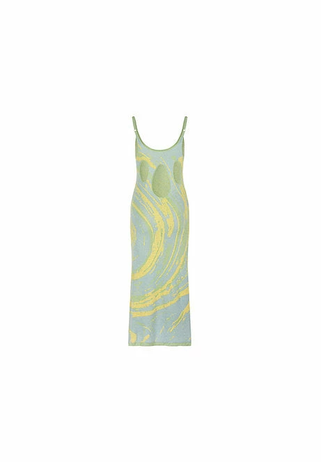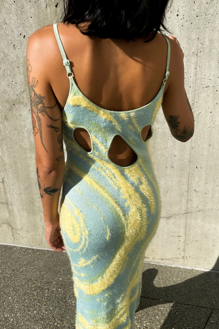 House of Sunny knit midi Hockney slim fit dress in psychedelic cypress cucumber green. Super soft knit dress with adjustable straps and unique cut out back detail.