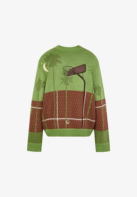 House of Sunny Slam Dunk v neck knit sweater. Teasing the line between preppy and sporty, this classic jumper features a vintage basketball scene. Details like embroidered stars and appliquéd athletes liven up the jumper’s knitted backdrop. The ensemble is completed with a ribbed V-neck, hem and cuffs, alongside dropped shoulders for a nonchalant fit.