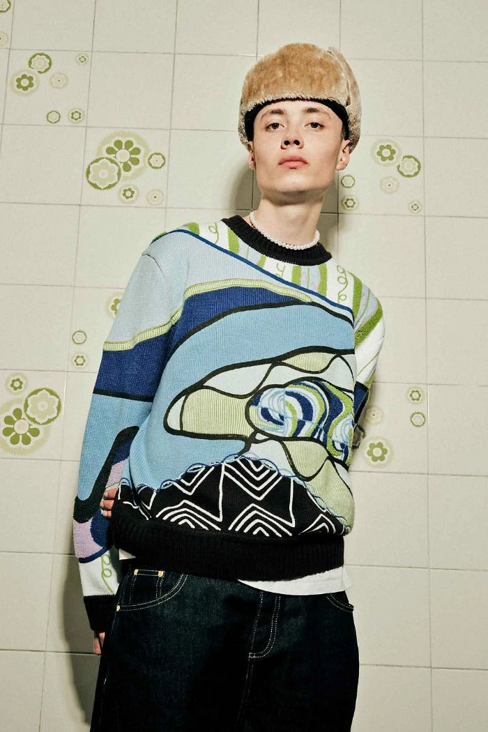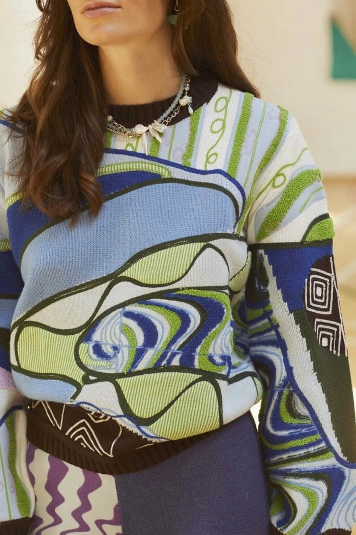 House of Sunny Hypnotise Landscape knit sweater. Hypnotically chaotic yet beautifully crafted. It has a familiar ribbed crewneck, cuffs and hem, alongside dropped shoulders for a loose fit. Smooth and ribbed knits, patchwork, embroidery and appliqué all clash together to form the landscape of your wildest dreams.